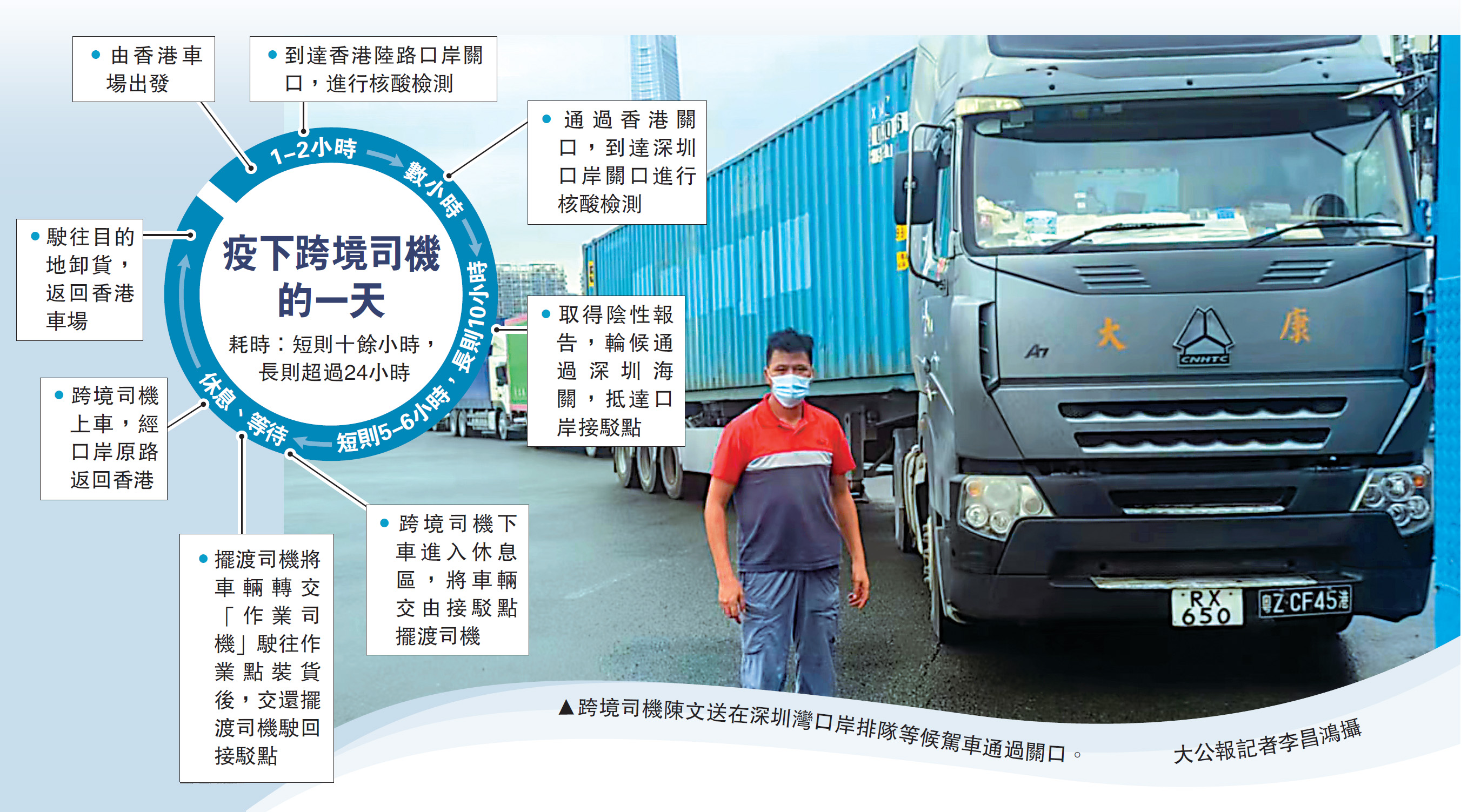 15日,陳文送凌晨兩點便從香港出發,開始了工作:先過香港海關,做核酸測試,一個半小時後到達深圳灣,再做測試,等核酸報告。拿到「雙陰性」結果,終於可啟程前往附近的口岸接駁站,然而大量跨境貨車等候過關造成的長時間排隊,使得他在當天下午三四點才順利到達接駁站。「一公里路程有時要排隊10個小時。」陳文送說,情況順利時,也要花上五六個小時。