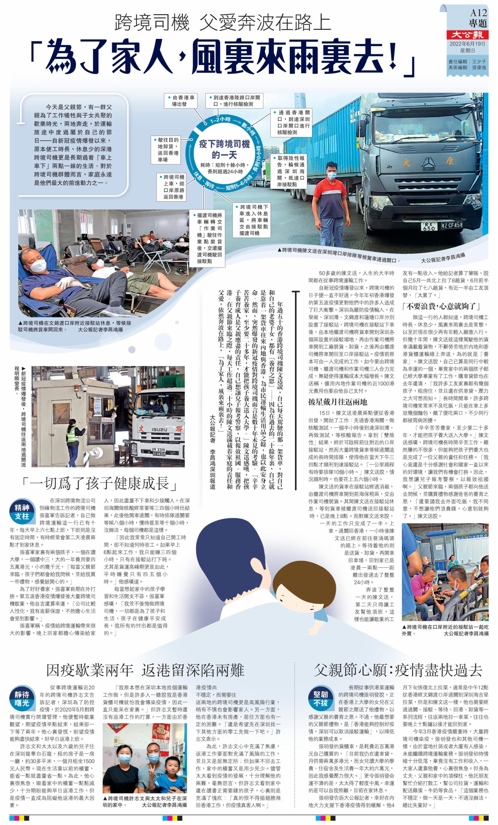 年過五十的香港跨境司機陳文送說,自己每天駕駛的那一架貨車,對自己和自己的老婆子女,都有「養育之恩」——因為在過去的二十餘年裏,自己就是靠着一架貨車往來內地與香港,為市民運輸生活用品之餘,也以此安身立命。然而,突然爆發的新冠疫情對跨境司機而言是數十年未見的考驗。「辛辛苦苦養家,至少要二十多年,才能把孩子養大送入大學。」陳文送感嘆,把孩子養育成人是父親應盡的責任,自己想讓兒子報考警察,以報效祖國、服務香港。在父親節來臨之際,每天工作超過二十小時的陳文送滿載着家庭的責任和父愛,依然奔波在路上,「為了家人,風裏來雨裏去!」