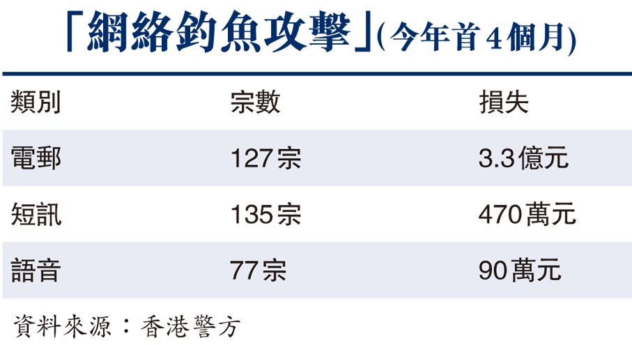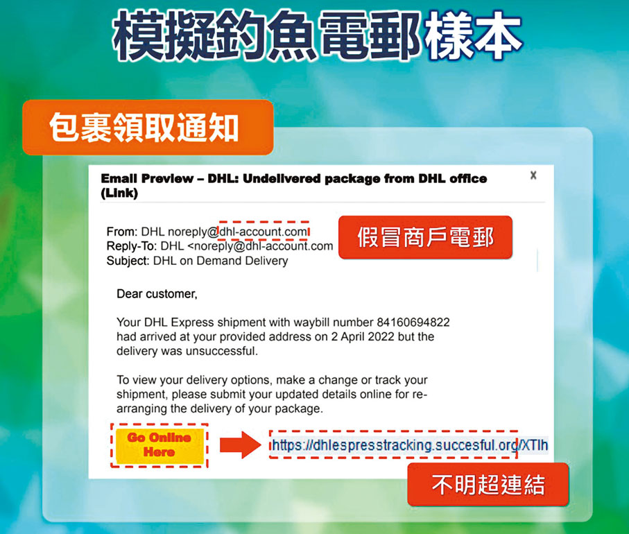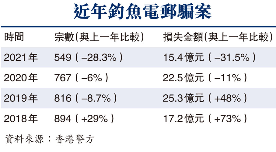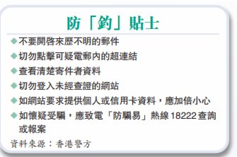 (香港文匯報記者 杜傑)在互聯網時代,特別是在新冠疫情影響下,市民依賴手機或電腦代替實體交易,已經成為生活不可分割的部分,不過,全球面臨電訊和網上詐騙的嚴重威脅,香港也難獨善其身。其中「網絡釣魚攻擊」騙案屢爆不絕,騙徒利用黑客高端技術,以隱藏的域名偽裝在不同地區,發放附帶有惡意連結、二維碼的釣魚電郵或短訊等,並應用於各類不同場景的騙案中,市民稍不留神,一旦開啟連結,便會令手機和電腦中門大開,被植入木馬程式後,所有網上交易都「裸露」給騙徒,繼而個人賬戶甚至連累公司賬戶被「騎劫」。今年首4個月香港警方接獲的報案中,「釣魚攻擊」騙案就有339宗,被騙市民損失金額約佔整體科技罪案10億港元的三分之一。今年5月至8月是警隊防騙宣傳季,香港文匯報記者根據警方講解的案例,整理和拆解五大「釣魚」陷阱。