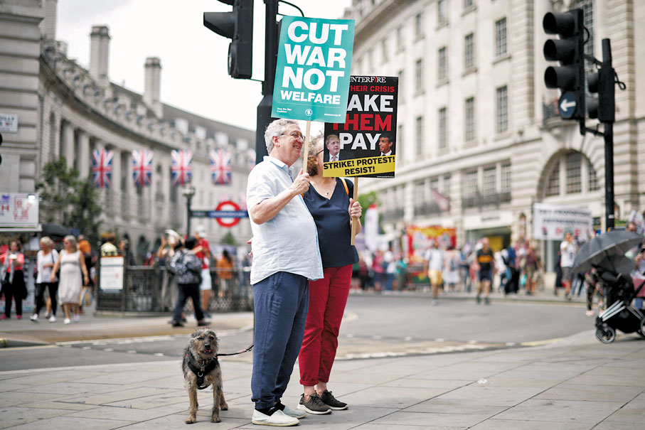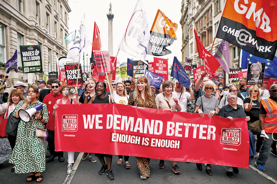 香港文匯報綜合報道:英國倫敦前日有數千人示威,抗議生活成本上漲,批評首相約翰遜的保守黨政府對民生困苦袖手旁觀,要求當局採取更多紓困行動。英國多個公營及公共事業的從業員代表工會則警告,政府應該提升教師及醫療人員等的薪金,協助他們追上通脹,否則工會將發動罷工。