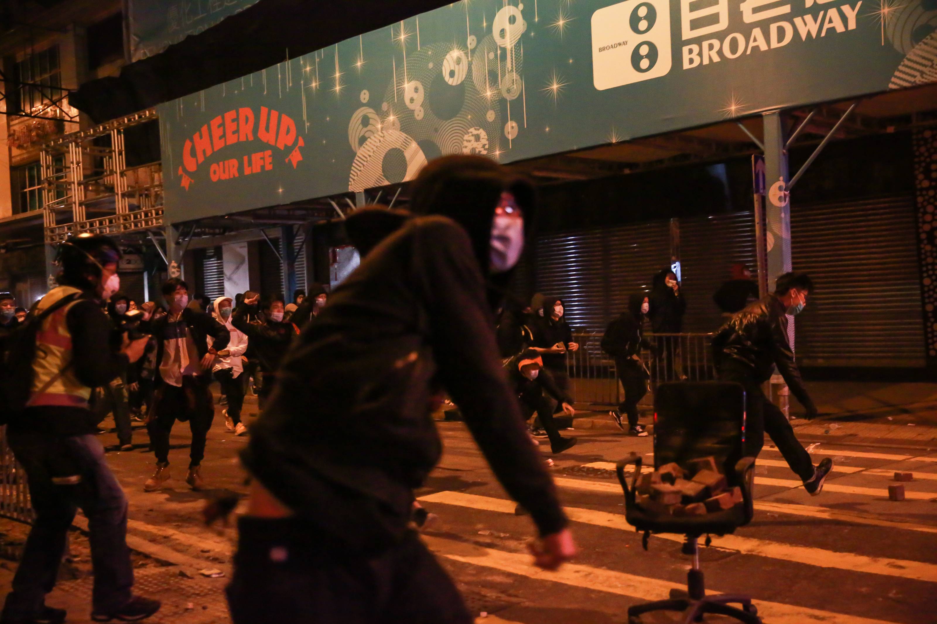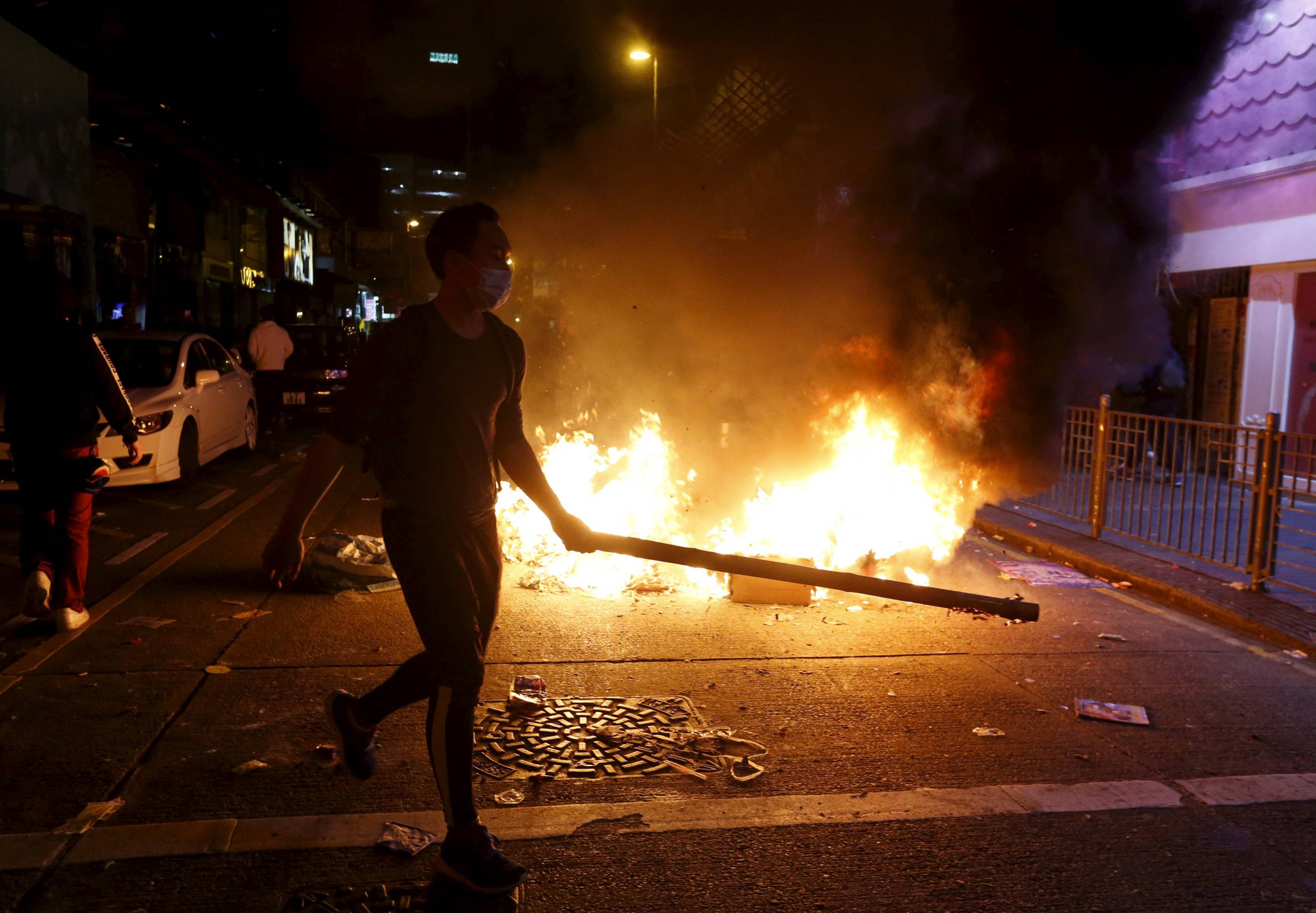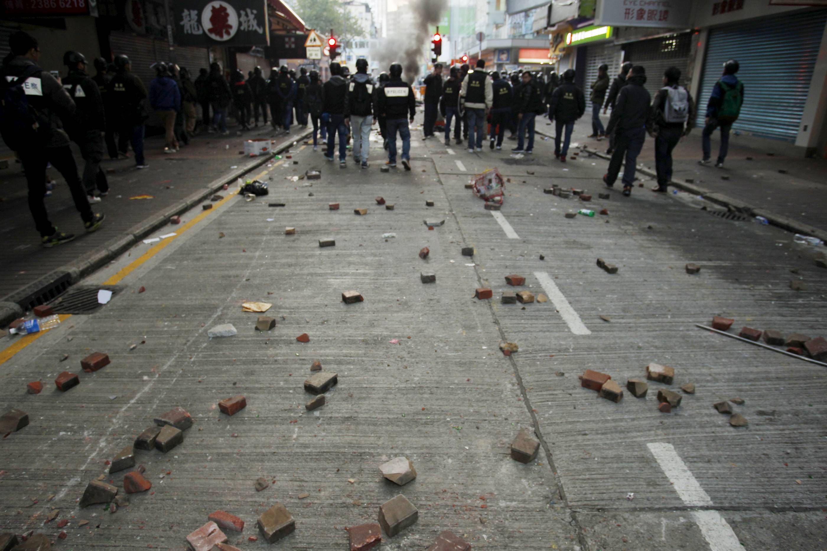 在暴亂中,有暴徒在旺角多處縱火,用雜物阻塞彌敦道等旺角主要道路。暴徒撬起人行道上的磚塊襲擊警員。據了解,當日有至少700名暴徒參與,波及14條街道,行人路被撬起的地磚共2000塊。