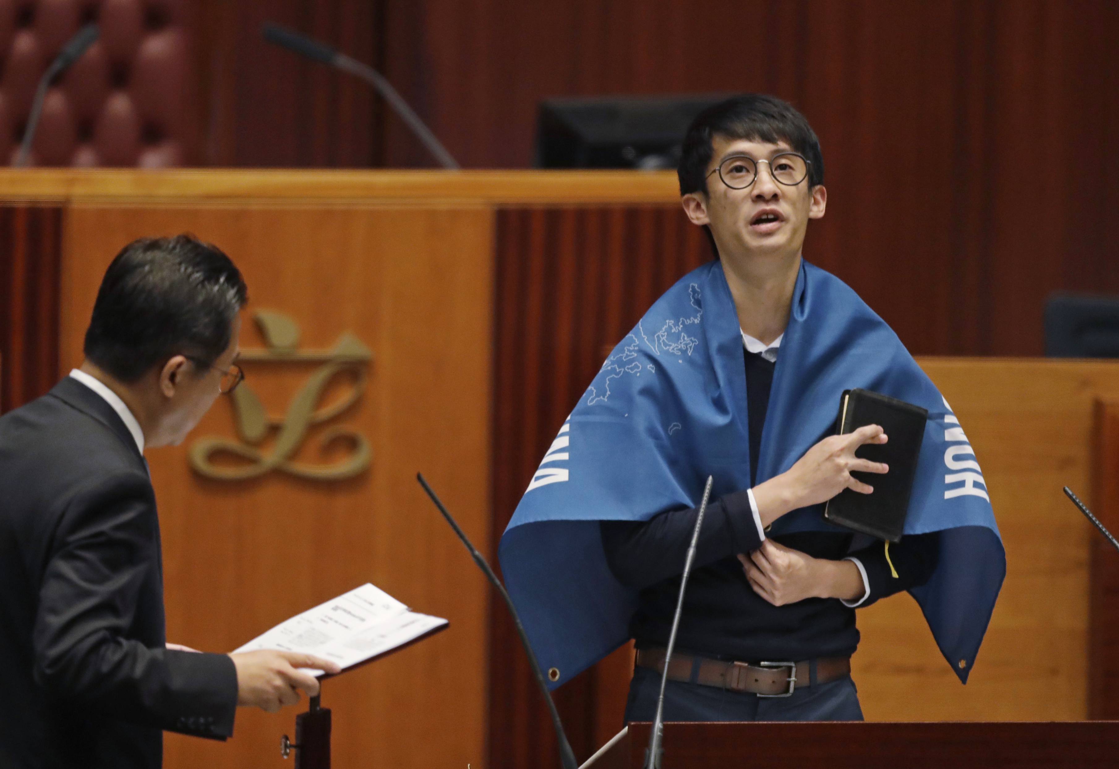當日共有15名攬炒派議員,包括不同黨派人士在宣讀誓詞前後增加內容,或以不同道具、形式等表達所謂的政治理念、訴求等。立法會秘書長陳維安監誓期間,拒絕為其中三人監誓:姚松炎在第一次宣誓修改誓詞,其後在秘書長警告後,按誓詞讀成,但在完成誓詞後緊接讀出增加的內容。「青年新政」的梁頌恆及游蕙禎展示「HONG KONG IS NOT CHINA」標語,並在宣誓時更改誓詞內容。梁頌恆先宣讀一段效忠「Hong Kong Nation」的內容,其後以較為輕的語氣讀出誓詞(英文版本),其中將「CHINA」讀成帶有辱國性質的「Chi-na」。游蕙禎在宣誓時以較快速讀出誓詞(英文版本),其中將「CHINA」讀成被指帶有辱國性質的「Chi-na」。