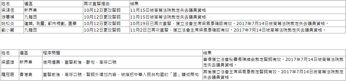 截至2017年7月14日,有6人被褫奪議席(DQ),包括梁頌恆、游蕙禎、梁國雄、姚松炎、羅冠聰及劉小麗。他們經由時任行政長官梁振英及律政司向法院提出司法覆核,後被高等法院取消議員資格。