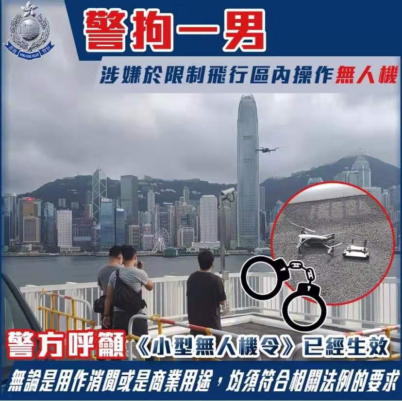 警員於昨午(19日)在尖沙咀海港城附近巡邏期間,發現一名涉嫌違反《小型無人機令》的男子,在事前沒有得到民航處許可下,於限制飛行區內操作無人機。事件中沒有人受傷及財物損毀。警方其後以「未經許可在限制飛行區內進行飛行」罪名拘捕該名男子,並檢取其無人機及配件。
