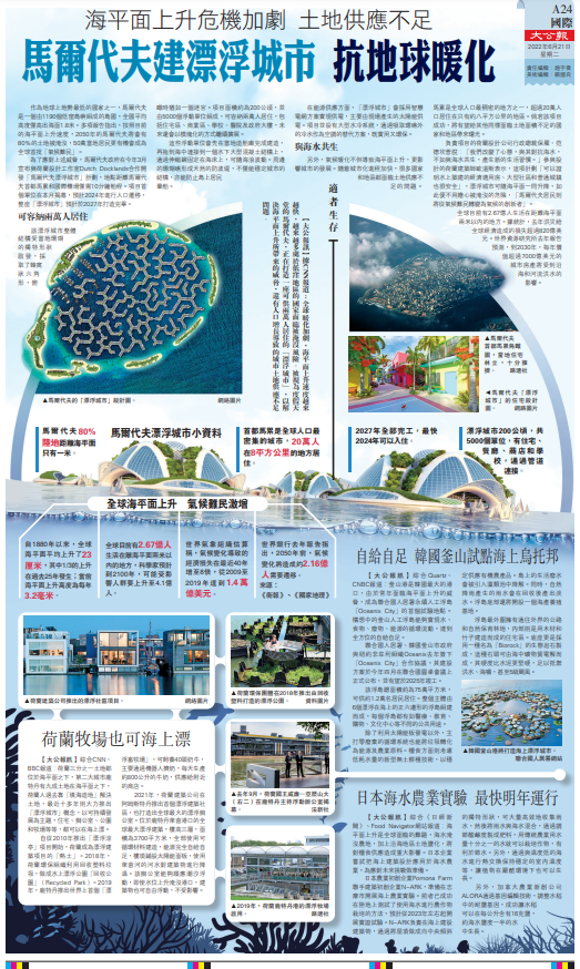 大公報據CNN報道:全球暖化加劇,海平面上升速度越來越快,越來越多處於低窪地區的國家面臨被淹沒風險。被視為度假天堂的馬爾代夫,正在打造一座可供兩萬人居住的「漂浮城市」,以解決海平面上升所帶來的威脅,還有人口增長導致的城市土地供應不足問題。