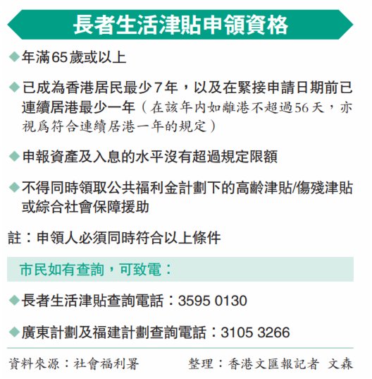 (香港文匯報 記者 費小燁、張弦)香港特區政府社會福利署昨日宣布,將於今年9月1日落實合併長者生活津貼(長生津)的普通津貼及高額津貼,每月津貼金額將與目前高額津貼的3,915元看齊,意味現時約5萬名正領取2,920元普通津貼的長者,每月可額外獲發995元。長生津合併後,單身長者的資產上限將由現時高額津貼的16.3萬元劃一放寬至37.4萬元,長者夫婦上限則由現時24.7萬元劃一放寬至56.8萬元;每月入息限額則維持不變(見表)。有關安排同樣適用於廣東計劃及福建計劃。凡於合併前已正在領取普通津貼的長者,無須提交任何申請,將於今年9月1日起自動獲發較高額的津貼,新申領而合資格的長者也將領取較高額的津貼。有立法會議員指合併後可令長者有益處,但亦有學者指長遠而言,推行社會保險式的退休保障制度可以讓長者更有生活保障。