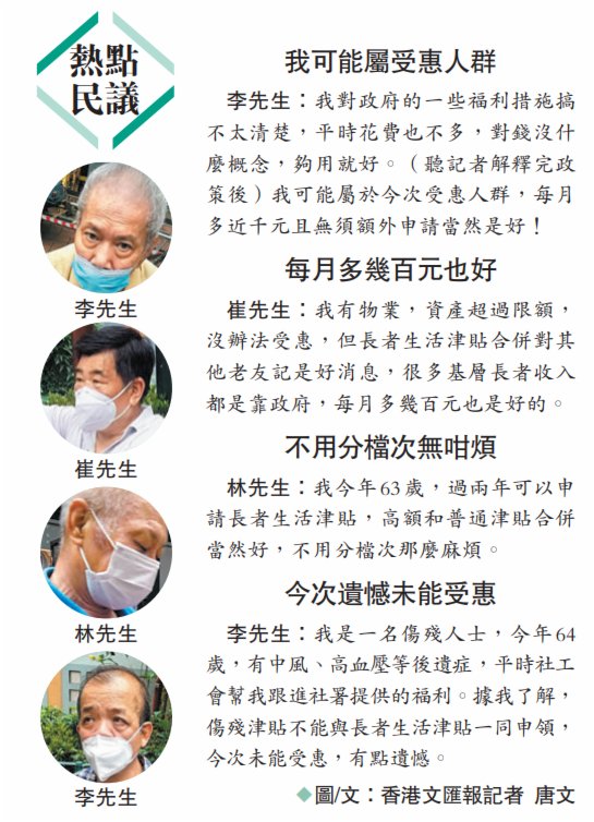 社署發言人昨日表示,以個人或夫婦名義申請的長者生活津貼是現時最多長者領取的社會保障金額,惠及逾64萬名長者,佔65歲以上人口42%。政府在2013年推出長者生活津貼後持續改進計劃,包括在2017年放寬資產上限,並在2018年推出高額津貼,以及由2020年起擴展計劃以惠及在廣東和福建退休的長者。
