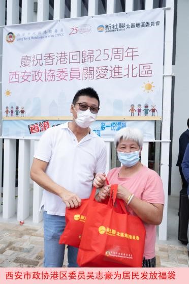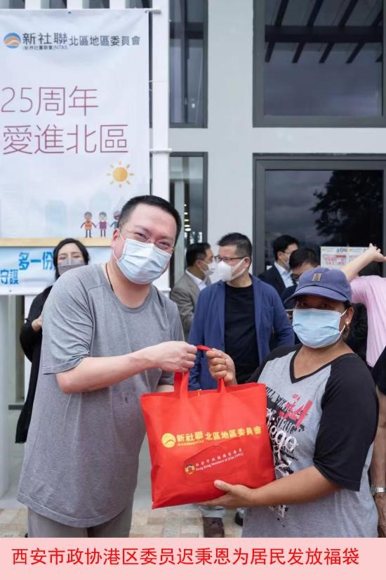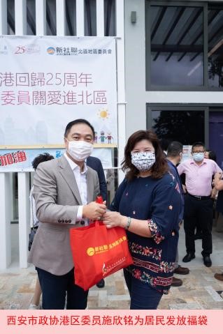 西安市政協常委、港區委員召集人王增讓,新社聯北區地區委員會主席溫和輝,立法會議員陳月明、陳沛良,仁愛堂第四十三屆董事局主席鄭慧賢,驪山公司副總經理王曉斌,香港大埔區民政事務署常務副主席牟彤和11位港區政協委員共46人一同參加啟動禮,一起為北區寮屋、劏房戶及困難戶派發福袋、面對面為鄉親們送去祝福和關愛。