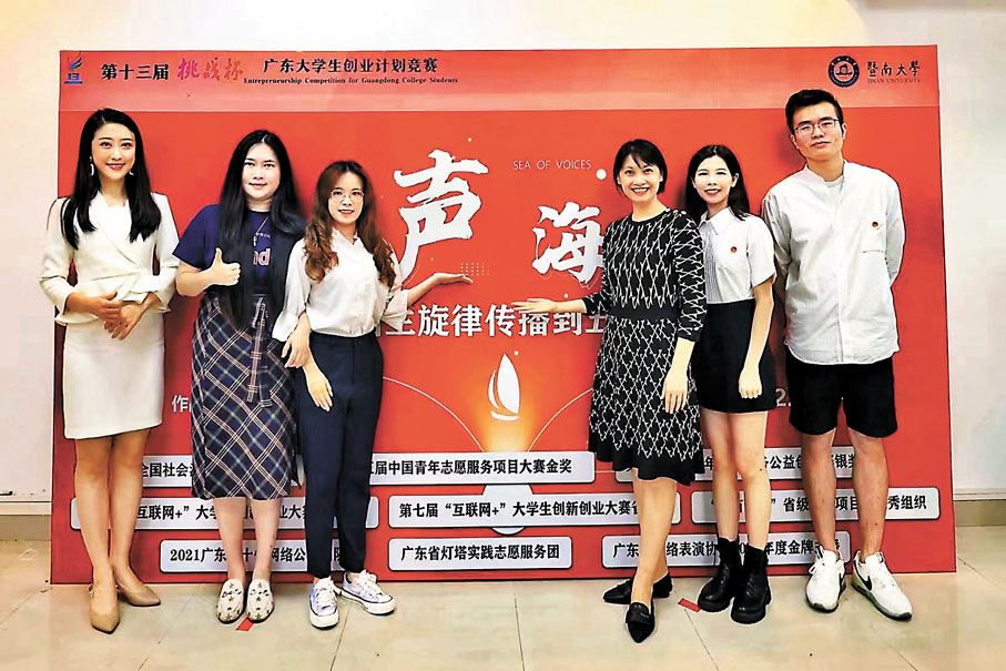 暨南大學新聞與傳播學院口語傳播系主任林小榆三年前在學院開設「聲海工作室」,八成成員是香港學生。「暨大有很多優秀的香港校友,讓他們和在校學生講自己的創業故事。同齡人影響同齡人,青年人影響青年人,從這個角度出發,讓香港學生去講述最合適。」