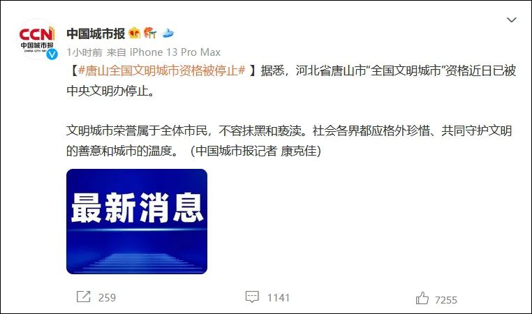 據中國城市報微博22日消息,據悉,河北省唐山市「全國文明城市」資格近日已被中央文明辦停止。