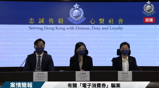 大公文匯全媒體報道,警方今日(22日)公布一宗與政府「電子消費券」有關的騙案,案件中警方共拘捕9名男女,包括7男2女,年齡介乎16至46歲,其中7人相信與一個犯罪集團有關,部分人有黑社會背景。另外有2人因涉及盜取朋友及前伴侶消費券被捕。