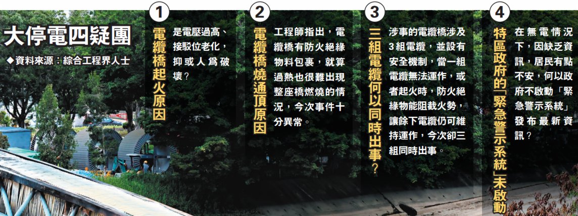 同時,電纜橋還設有安全機制,「當其中一組電纜出現故障時,就會啟用餘下兩組電纜,但今次事件顯示該機制未被啟動。」即使電纜橋燒毀,通常情況下還有基本後備機制——即「環式供電」補鑊。「但今次電纜橋燒毀,直接導致3區大範圍停電,懷疑朗屏該處並未使用環式供電。」