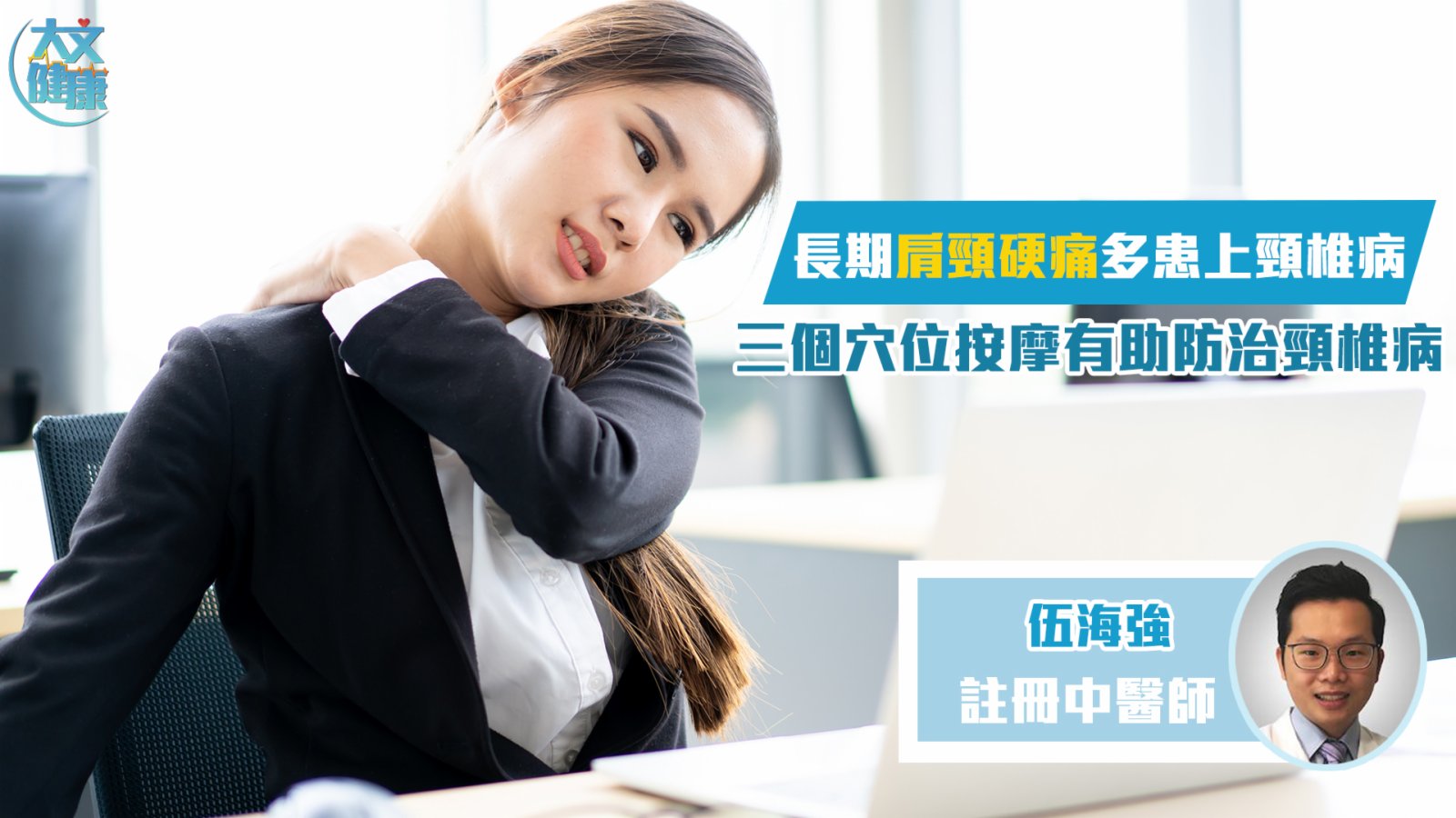 從頸椎病患者影像學檢查基本上可找到頸椎弧度變直、骨刺增生、韌帶鈣化、椎間孔狹窄等退化性病變的蹤跡。有的患者亦可同時發現頸椎前傾、側傾、椎體旋轉的現象,亦常見「寒背」、「高低膊」、「富貴包」等不良體態問題。頸椎退化性病變是漫長的過程,晚期時的症狀嚴重而且難治,因此,早期的預防及保護頸椎措拖對頸椎病的防治有着積極的作用。風池穴、百勞穴、肩中椎穴是中醫常用治療頸椎病的穴位,閒時按柔,有着預防保健、舒緩肩頸疲勞的功效。