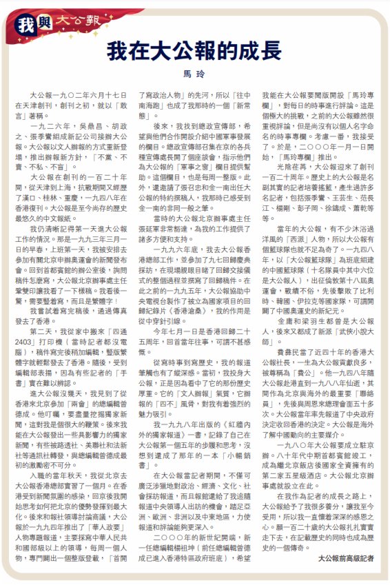 在我作為記者的成長之路上,大公報給予了我很多養分,讓我至今受用,所以我一直懷着深深的感恩之心。願一百二十歲的大公報扎扎實實走下去,在記載歷史的同時也成為歷史的一個傳奇。