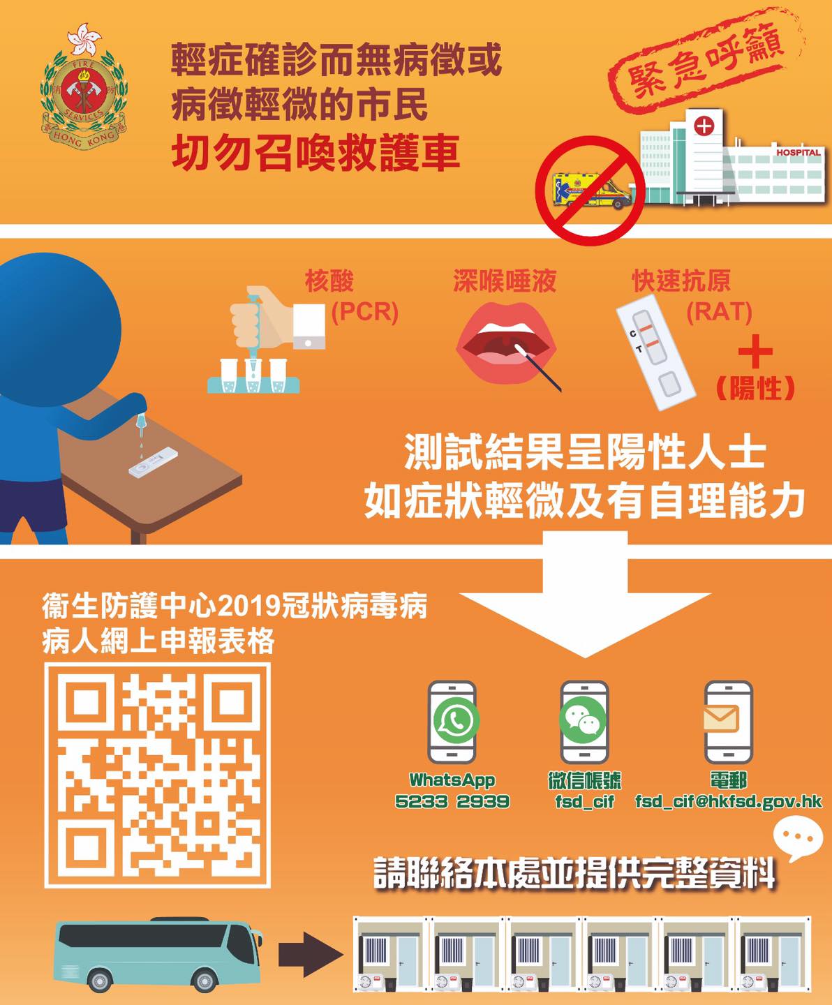 消防處呼籲輕症確診市民,無需急於召喚救護車到急症室,將有限的救護服務資源留給有急切需要的重症人士。如市民快速抗原測試/核酸檢測呈陽性,請善用「快速抗原測試陽性結果人士申報系統」提供資料。