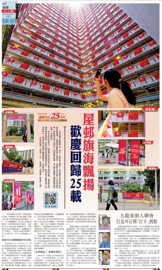 (大公報記者 王亞毛 <文> 麥潤田、何嘉駿、林良堅 <圖> )公共屋邨不僅陪伴着一代又一代香港人成長,更見證着多年來的社會發展與變遷。為慶祝香港特區成立25周年,房屋署近日在轄下公共屋邨張掛「特區政府成立25周年」的橫幅及海報。坪石邨更整幢大廈滿掛國旗與區旗,喜氣洋洋。 圖> 文>