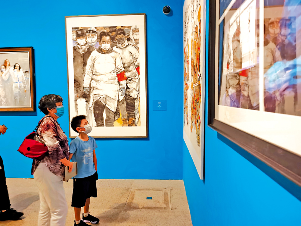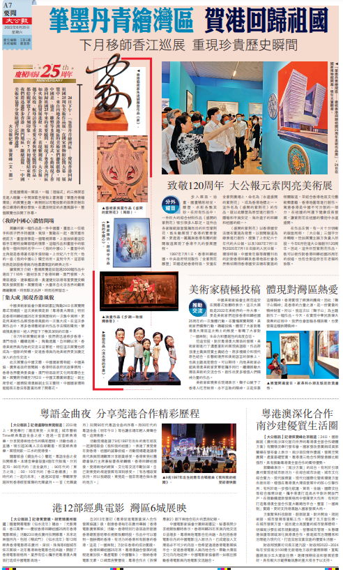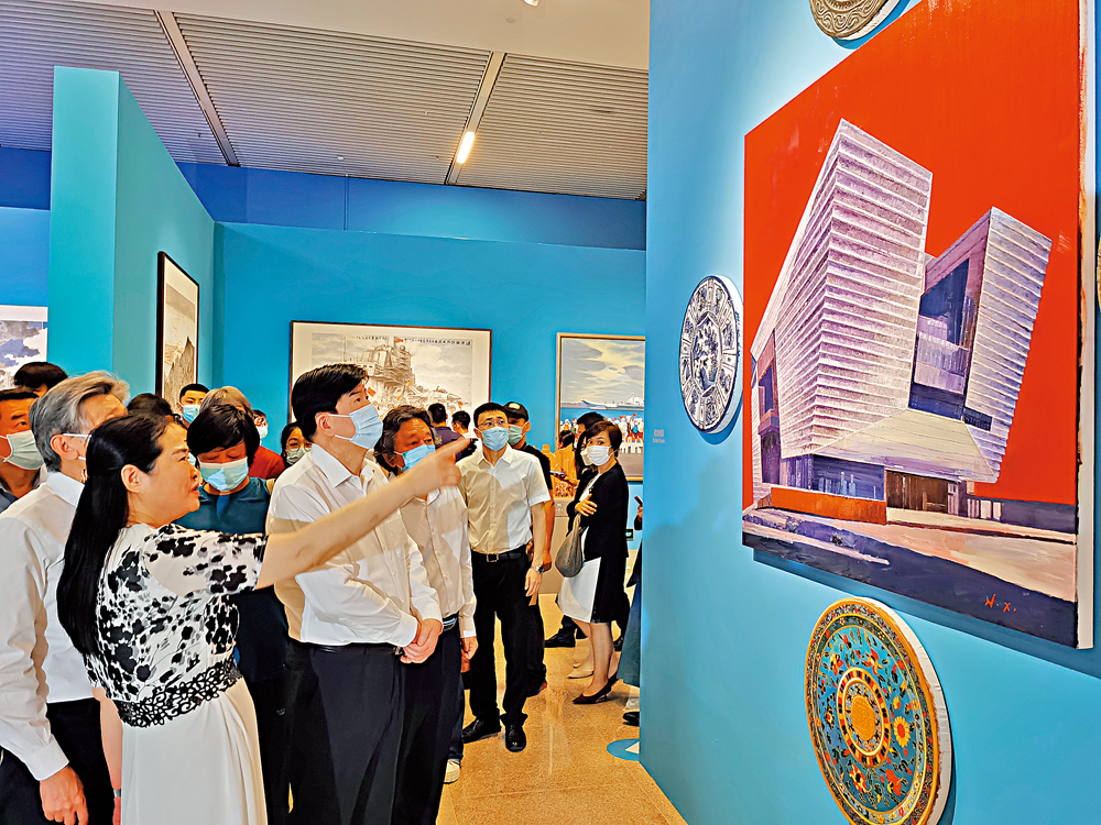 【大公報記者 張寶峰(文、圖)】24日下午,「筆墨丹青繪灣區—慶祝香港回歸祖國25周年美術作品展」在國家博物館拉開大幕。展覽中,來自內地及港澳地區的美術家們聯袂獻藝,用中國畫、油畫、雕塑等多種表現形式,生動展現了香港回歸祖國25年來的重要瞬間,展現了粵港澳大灣區如火如荼的發展進程,其中,表現紫荊花、大公報、攜手抗疫、航母訪港等重要元素與歷史瞬間的作品,都給觀眾留下了深刻印象。「在7月初展覽結束後,我們將迅速移步香港、澳門地區,繼續巡展。」中國美術家協會分黨組副書記陶勤透露。