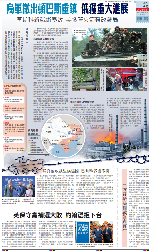 大公報綜合CNN、路透社、《華爾街日報》報道:俄羅斯軍隊過去數周在烏東盧甘斯克地區重鎮北頓涅茨克市發動猛攻,目前已控制全市九成以上地區。盧甘斯克軍事行政長官蓋代24日透露,烏克蘭守軍已接獲命令,撤出北頓涅茨克。美媒稱,烏軍可能在未來幾天從其在盧甘斯克控制的最後一座城市利西昌斯克撤出,意味着俄軍將在爭奪頓巴斯地區控制權的消耗戰中取得具有重要象徵意義的勝利。