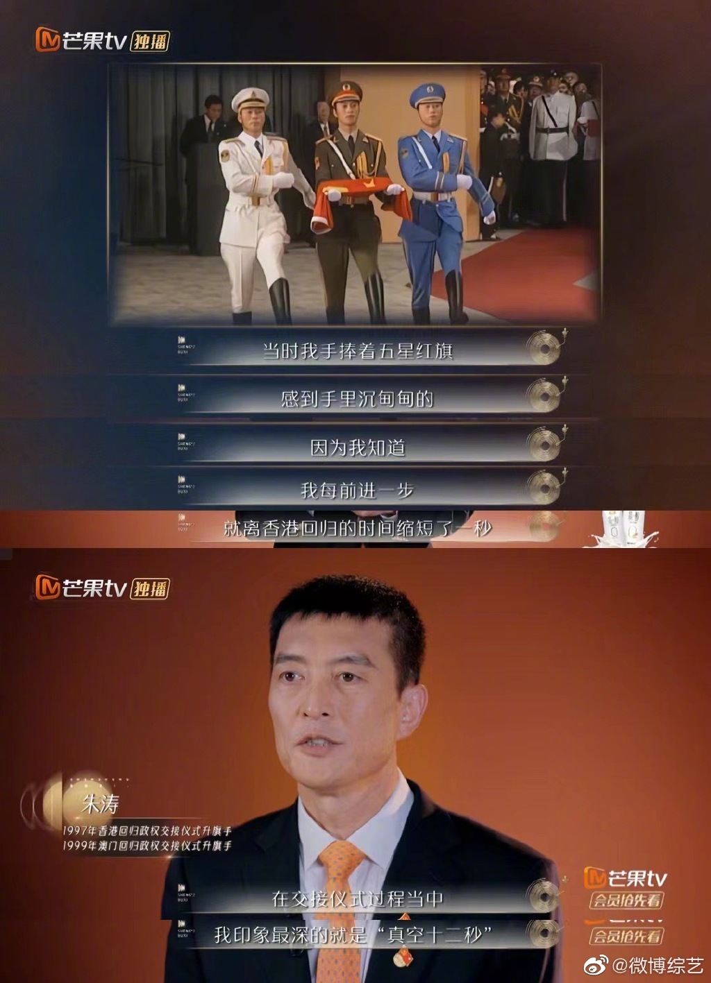 大公文匯全媒體報道,今年是香港回歸祖國25周年,為慶祝這一盛事,芒果TV特邀無綫協製《聲生不息》。節目最新一期邀請到當年擔任香港回歸升旗手的朱濤分享感受,回憶起1997年香港回歸的場景,朱濤哽咽說:「我每前進一步,就離香港回歸的時間縮短了一秒」。