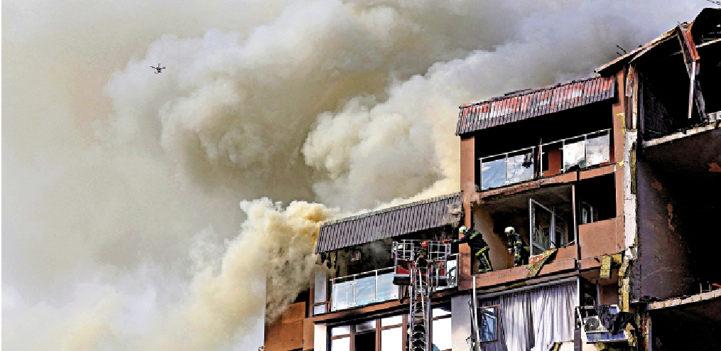 烏克蘭當局表示,基輔及所屬的基輔州26日被14枚導彈轟炸,其中一幢九層高的居民樓及一間幼稚園被擊中。被擊中的居民樓損毀嚴重,頂部三層全被燒毀。烏方稱從居民樓中救出一名7歲女孩,她的父親在襲擊中身亡。