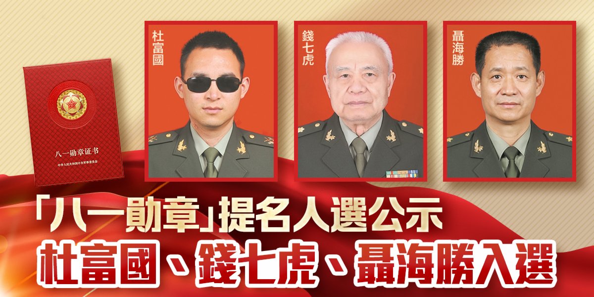 據中新社今日(27日)報道,經中央軍委主席習近平批准,在中國人民解放軍建軍95周年之際,中央軍委將評選頒授「八一勛章」。按照中央軍委統一部署,經軍委機關各部門和各大單位黨委提名推薦,軍委政治工作部組織資格審查和考核,近日產生3名提名人選:杜富國、錢七虎、聶海勝。
