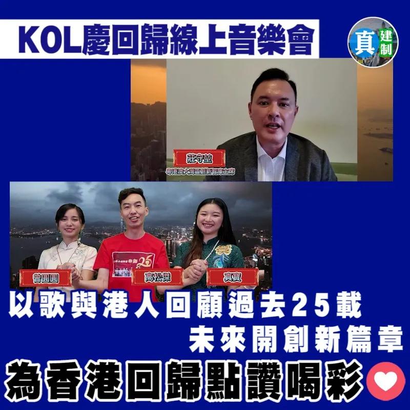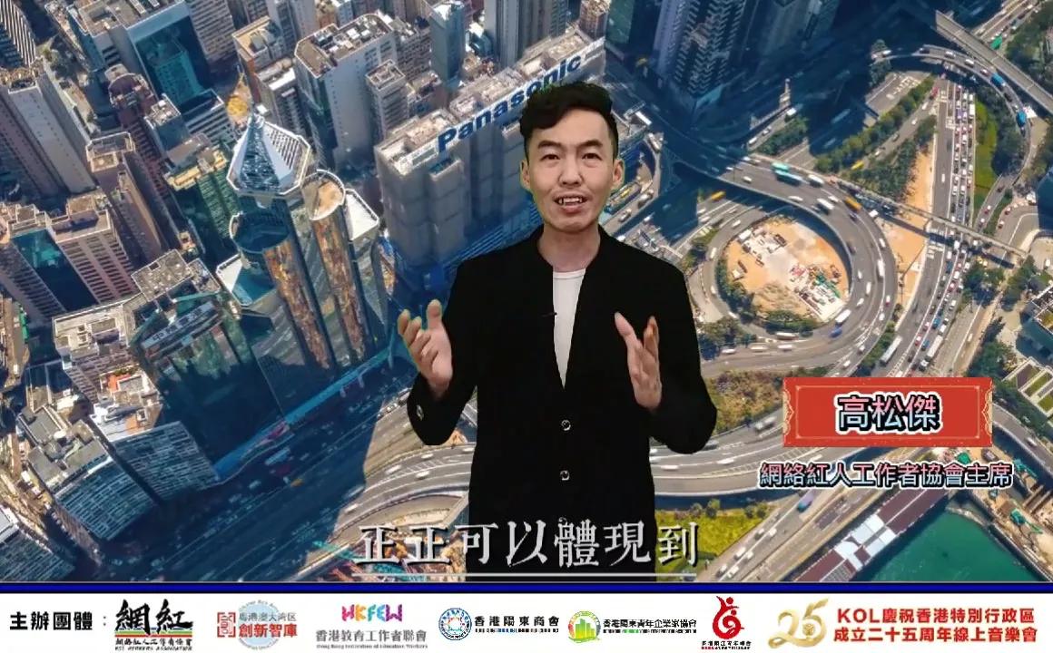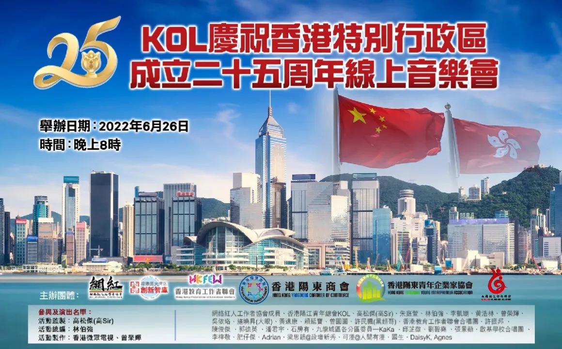 二十五歲是人生充滿活力幹勁的年華,無懼各種風浪和挑戰,遇強則強。城市也一樣,多年來,香港面對種種挑戰,都憑着堅毅不屈的精神乘風破浪,不斷蛻變成長,成為璀璨奪目的國際大都會。為慶祝香港回歸25周年銀禧紀念,網絡紅人工作者協會、粵港澳大灣區創新智庫、香港教育工作者聯會合唱團於2022年6月26日主辦《慶祝香港特別行政區成立二十五周年線上音樂會》,該活動由香港陽江青年總會、香港陽東商會、香港陽東青年企業家協會合辦,活動於多個KOL Yotube頻道廣播,同時亦於內地社交平台火熱轉播。 一眾青年KOL會以自家創作音樂方式,與內港青年網民回顧香港特區憑着堅毅不屈的精神乘風破浪,不斷蛻變成長,在祖國的大力支持下,終於成為璀璨奪目的國際大都會,並鼓勵青年勇於走進大灣區大舞台大展拳腳,實現大灣夢想。至今已有超過10萬人次觀看。