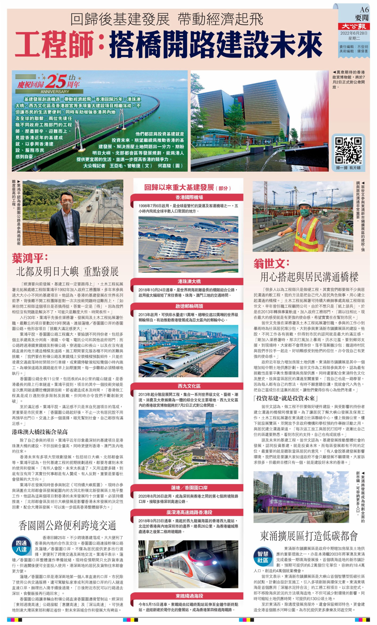 大公報記者 王亞毛、曾敏捷(文) 何嘉駿(圖):基建發展創造機遇,帶動經濟起飛。香港回歸25年,港珠澳大橋、西九文化區及香港故宮等多項重大建設項目相繼落成,不但讓市民的生活更便利,同時有助增強香港與內地及全球的聯繫。兩位先後任職不同政府工務部門的工程師,歷盡艱辛,迎難而上,見證香港近年的基建成就,以參與香港建設、服務市民感到自豪。