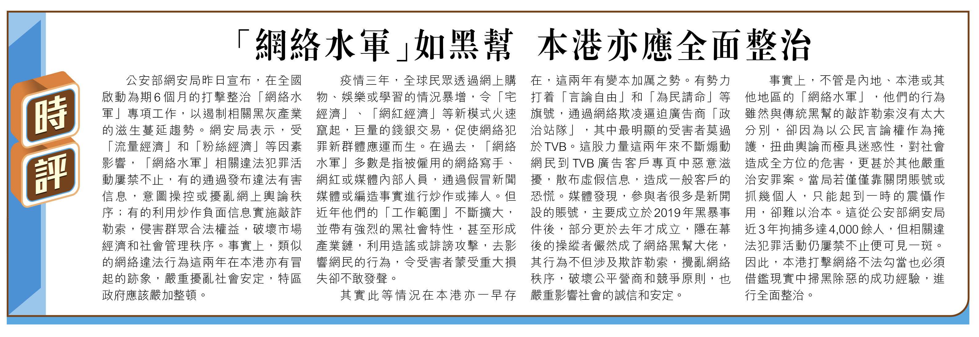 事實上,不管是內地、本港或其他地區的「網絡水軍」,他們的行為雖然與傳統黑幫的敲詐勒索沒有太大分別,卻因為以公民言論權作為掩護,扭曲輿論而極具迷惑性,對社會造成全方位的危害,更甚於其他嚴重治安罪案。當局若僅僅靠關閉賬號或抓幾個人,只能起到一時的震懾作用,卻難以治本。這從公安部網安局近3年拘捕多達4,000餘人,但相關違法犯罪活動仍屢禁不止便可見一斑。因此,本港打擊網絡不法勾當也必須借鑑現實中掃黑除惡的成功經驗,進行全面整治。
