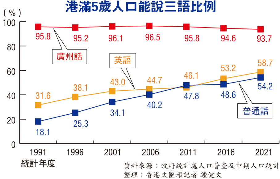 (香港文匯報記者 鍾健文)我國是一個多民族、多語言、多方言、多文種的國家,普通話是全國的通用語言。香港與內地交流日益緊密,在港人生活中,日常互動以至娛樂文化活動中接觸普通話機會愈來愈多。要把握好粵港澳大灣區建設及國家「十四五」規劃所帶來的機遇,積極融入國家發展大局,港人學好普通話十分重要。在香港回歸祖國的第二年,普通話科開始成為香港中小學核心課程,年輕一代學習普通話更為普及,整體程度也見提升。根據特區政府統計處資料,全港人口能說普通話的比例,在1991年為18.1%,至2021年大增至54.2%,同期能說英語比率亦增至逾58%,凸顯了「一國兩制」下香港的「兩文三語」特色,以及背靠祖國、溝通世界的獨特優勢。