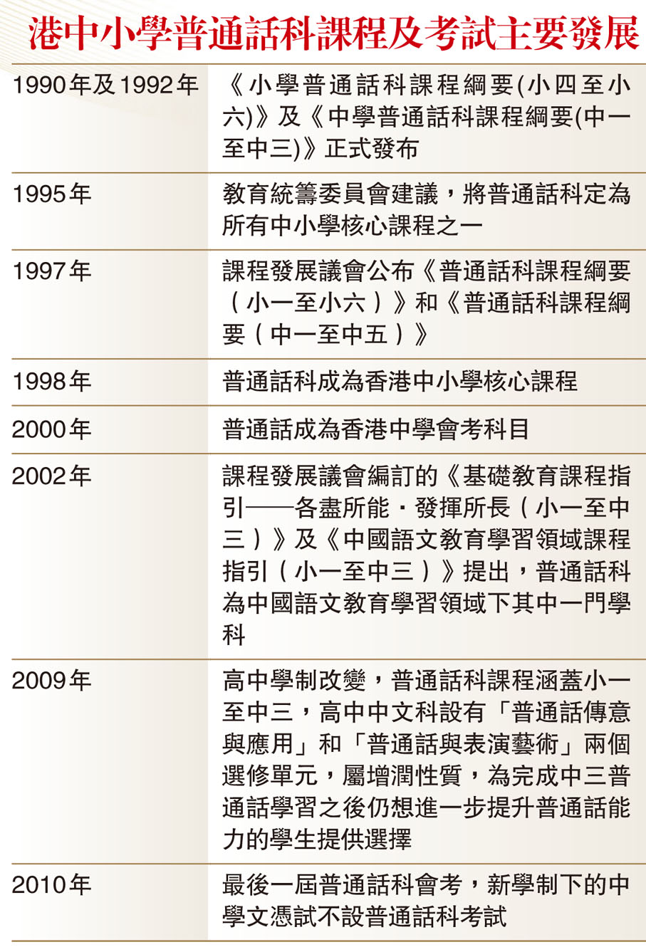 她指出,港人的普通話水平在回歸後確有提高,但還有需要提升,故建議特區政府應繼續加強師資培訓,同時要更有效推動「普教中」,如訂出全面的落實時間表,及考慮在文憑試重設普通話科等。