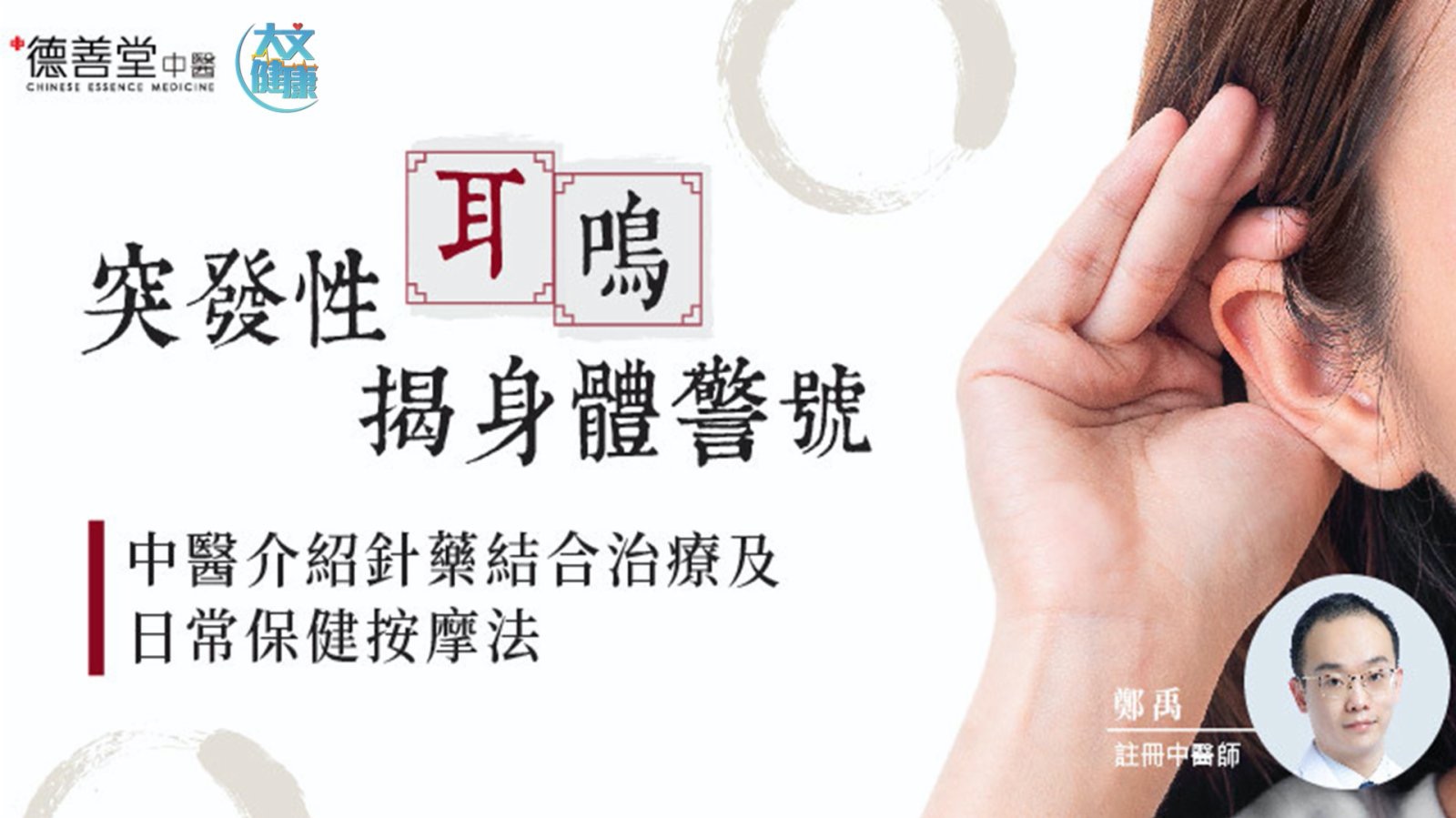 要特別注意的是,一些器質性的病變,例如腦部腫瘤、中耳炎等疾病均有機會導致耳鳴,大家若有任何健康問題,應及早向註冊中醫師諮詢及瞭解突發性耳鳴的治療方案。