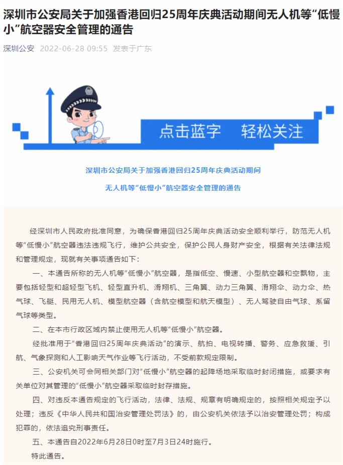 大公文匯網報道,深圳市公安局今日(28日)發布消息稱,為確保香港回歸25周年慶典活動安全順利舉行,6月28日0時至7月3日24時期間,在深圳行政區域內禁止使用無人機等「低慢小」航空器。