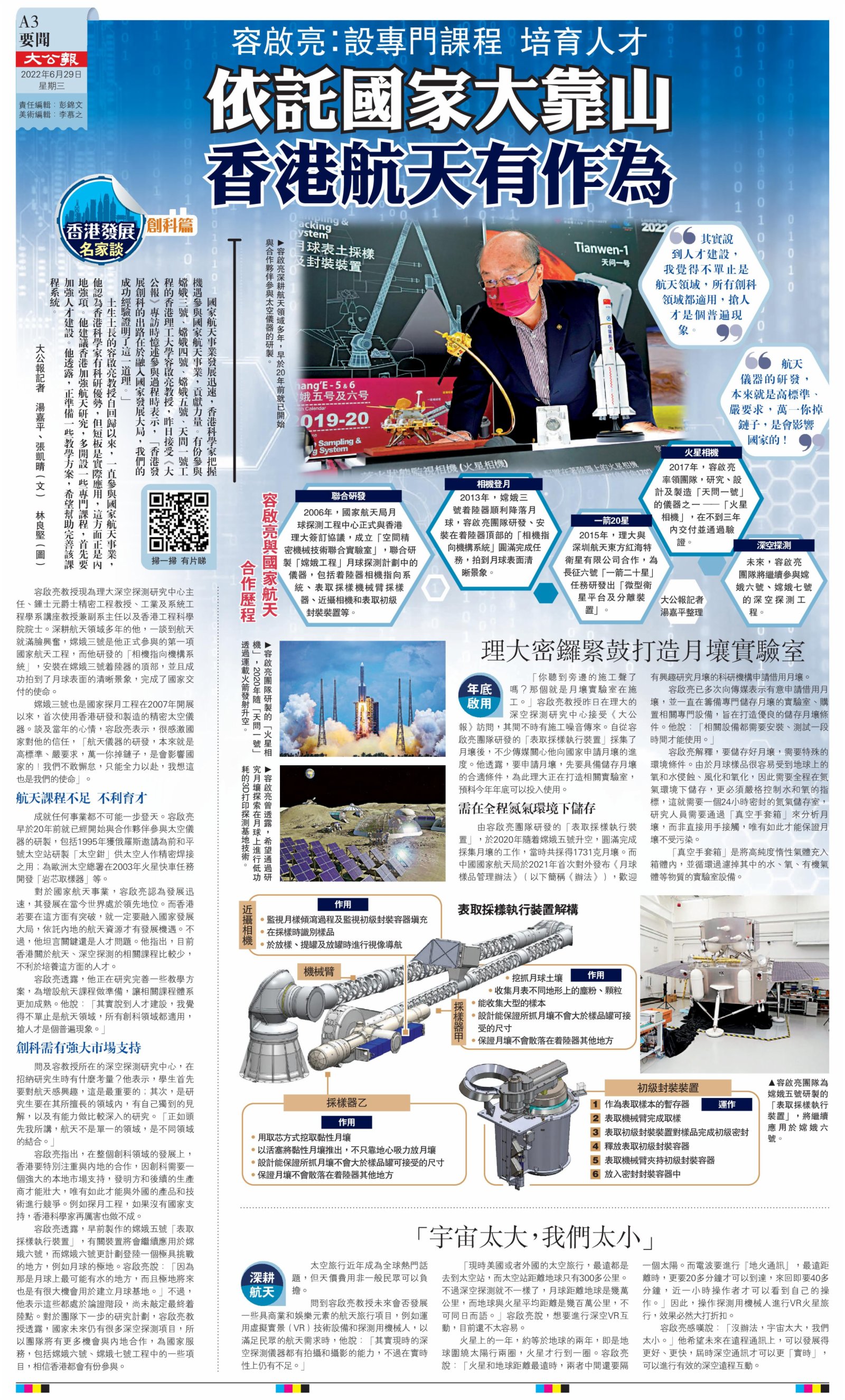 (大公報記者 湯嘉平、張凱晴<文> 林良堅<圖>)國家航天事業發展迅速,香港科學家把握機遇參與國家航天事業,貢獻力量。有份參與嫦娥三號、嫦娥四號、嫦娥五號、天問一號工程的香港理工大學容啟亮教授,昨日接受《大公報》專訪時憶述參與過程時表示,「香港發展創科的出路在於融入國家發展大局,我們的成功經驗證明了這一道理。」