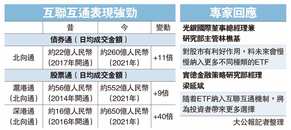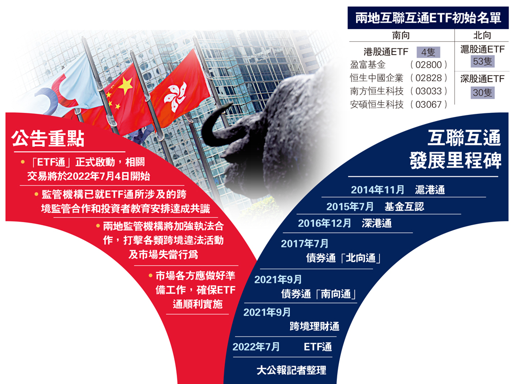 港交所歡迎ETF通的正式實施,又指合資格「北向」ETF初始名單(可買入及賣出),合共有83隻產品。內地交易所則公布,首批有4隻ETF獲首次納入「南向」ETF名單,分別是盈富基金、恒生中國企業、南方恒生科技、安碩恒生科技。