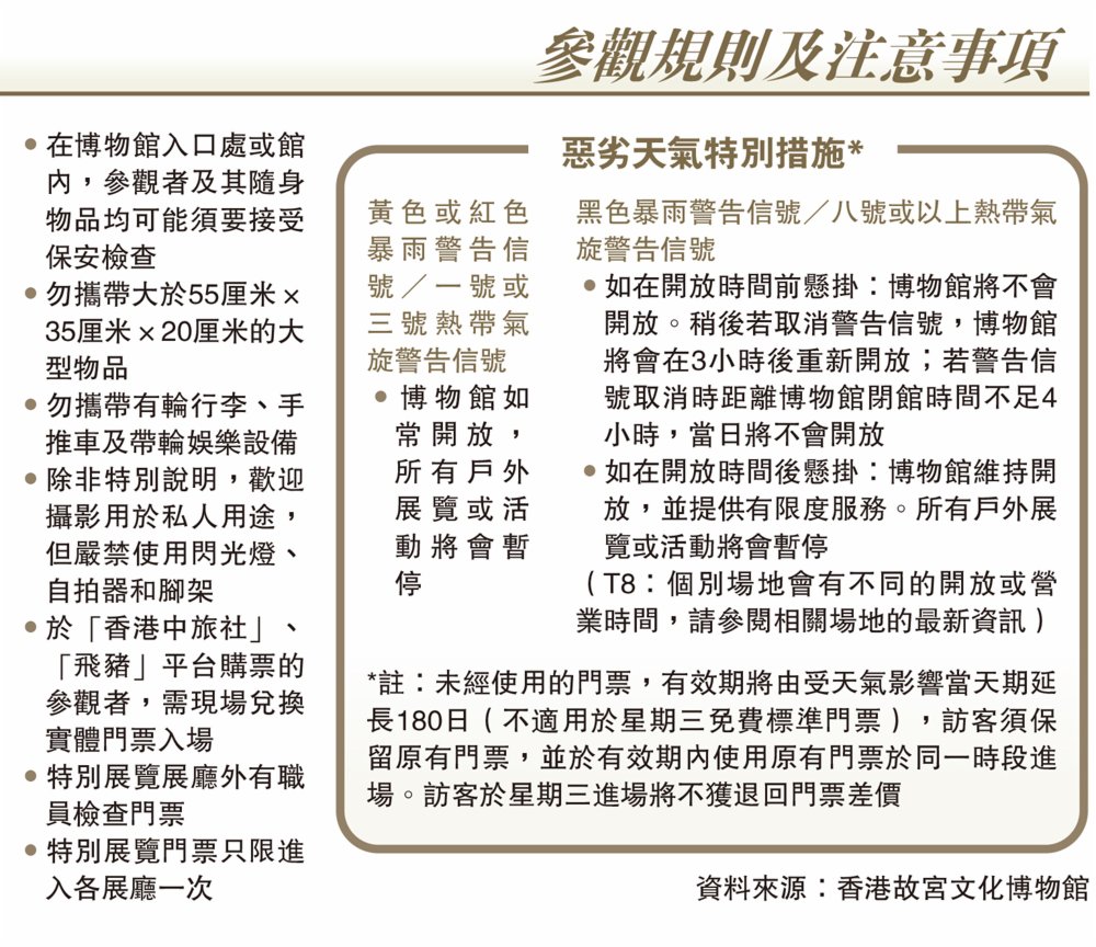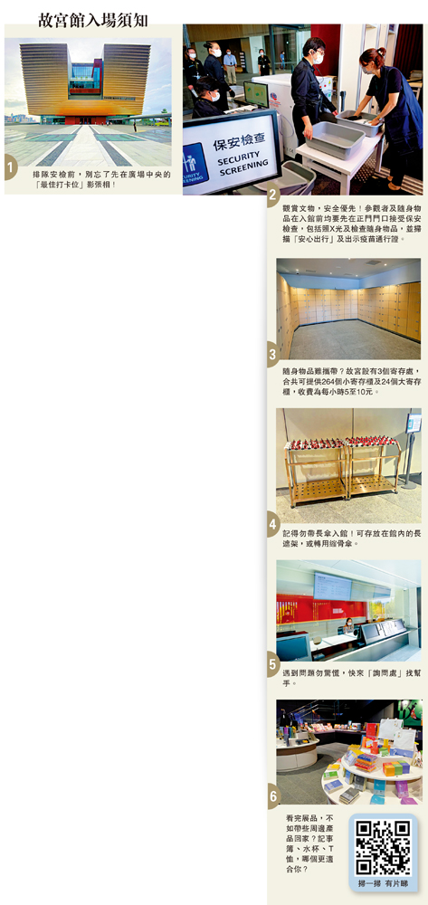 故宮館內可拍攝,料多處成為「打卡」熱點。館內提供寄存櫃,每小時收費5至10元;園內會提供15分鐘一班的免費穿梭巴士,亦有直達香港故宮門口的公共巴士,讓參觀體驗更加便利。