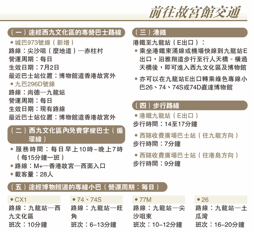 運輸署亦提醒市民,香港故宮開幕當日,西九文化區的公共運輸服務將會加強,計劃前往香港故宮文化博物館或M+博物館的市民,可選乘專線小巴、巴士和港鐵,西九文化區亦會安排每15分鐘一班的免費穿梭巴士,來往故宮文化博物館、M+博物館及西九文化區西面出口。
