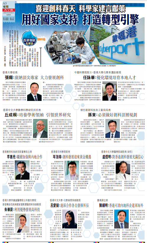 在喜迎香港回歸祖國25周年之際,香港創科界接受《大公報》記者訪問時紛紛表示,習近平總書記為香港創科帶來令人振奮的春天,如今是大步向前的最好時機!這些享譽盛名的老、中、青科學家,對如何發揮優勢、用好國家支持、抓住機遇實現創科突破,表達了真知灼見,十分難能可貴。