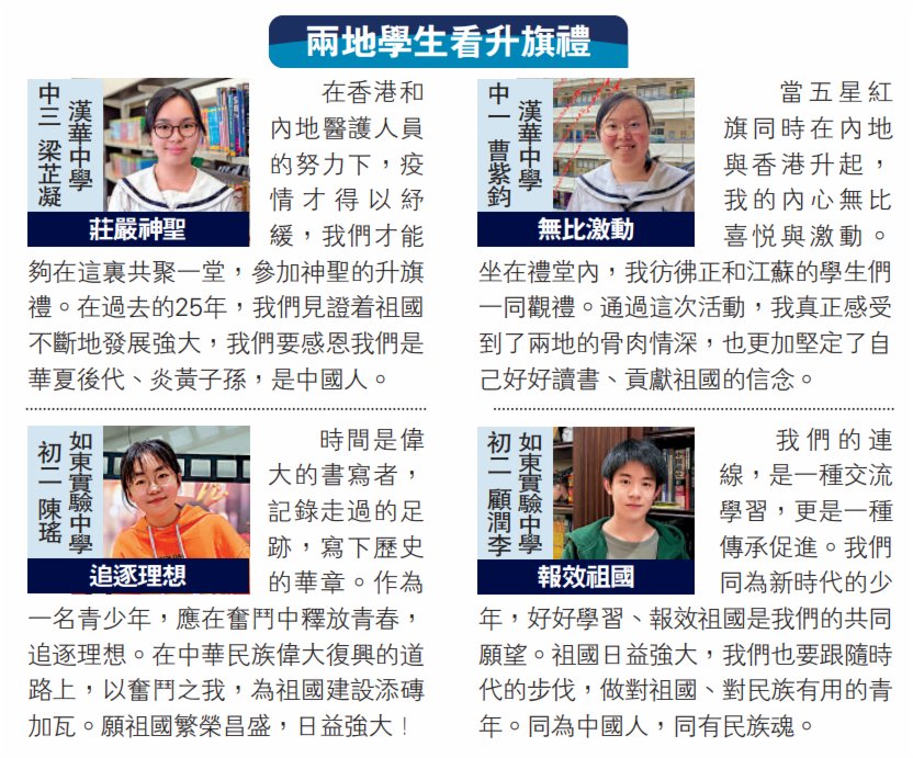 (大公報記者 葉心弦)慶祝香港回歸祖國25周年,漢華中學與江蘇省南通市如東實驗中學於6月27日共同舉辦「共升一面國旗,青春約定未來」主題活動。兩地學校以視頻連線方式,同步舉行升旗禮,學生代表在儀式後還進行聯誼表演。