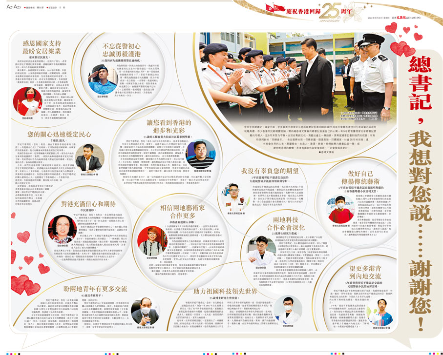 香港文匯報報道,中共中央總書記、國家主席、中央軍委主席習近平將出席慶祝香港回歸祖國25周年大會暨香港特別行政區第六屆政府就職典禮,不少香港市民都展露笑臉,期待藉香港文匯報向總書記表達自己的心聲。有5年前曾獲得習近平總書記鼓勵的年輕人,這5年來努力不懈,分別在粵劇文化、貢獻社會上一展所長,更希望總書記看到他們的成長;有與特區同齡的「回歸青年」,各自服務社區、保衛家園、銳意創新,回饋國家、社會25年的培育;還有社會各界的人士,基層婦女、生意人、港漂、長者。他們都想向總書記說一聲︰感謝您對香港的關懷,香港有國家作為堅強後盾,一定會發展得更好!