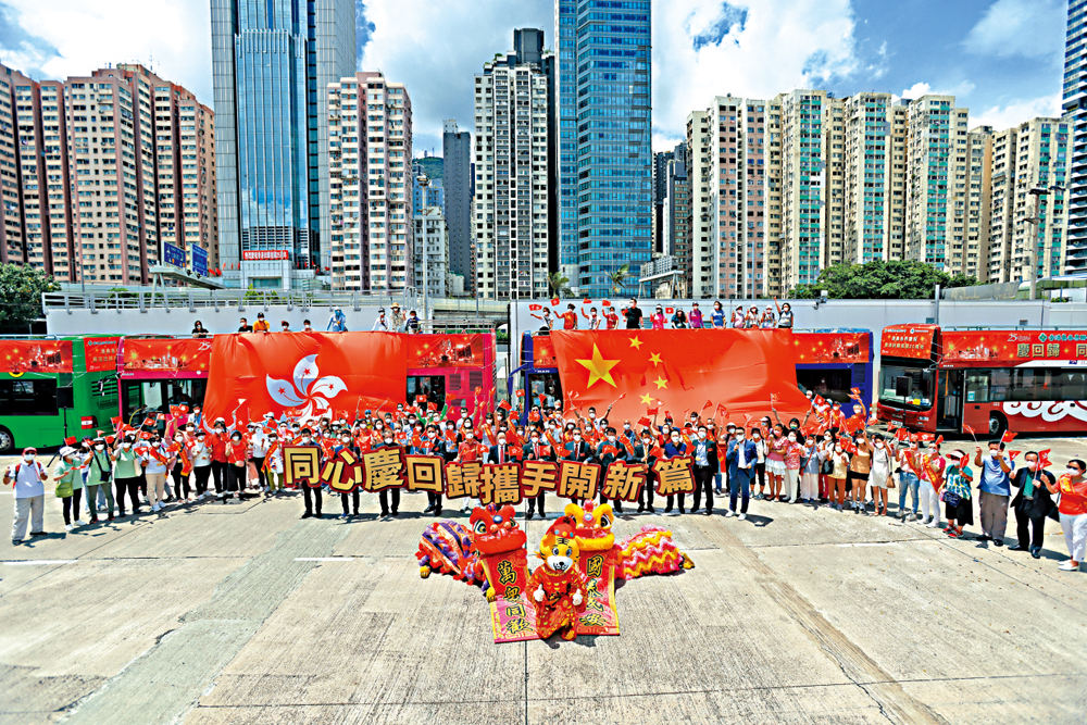 香江喜意盎然,同慶特區生日。香港島各界聯合會29日舉行「慶祝香港回歸祖國25周年巴士巡遊」,4部開篷巴士,載着100位堅守抗疫前線的優秀義工環遊港島。義工們揮舞旗幟,與沿街市民互動。有參與巡遊的義工開心地說,希望弘揚同心抗疫、助人自助精神。他們在流動的巴士上,更深刻感受到全城同慶特區生日的喜悅。
