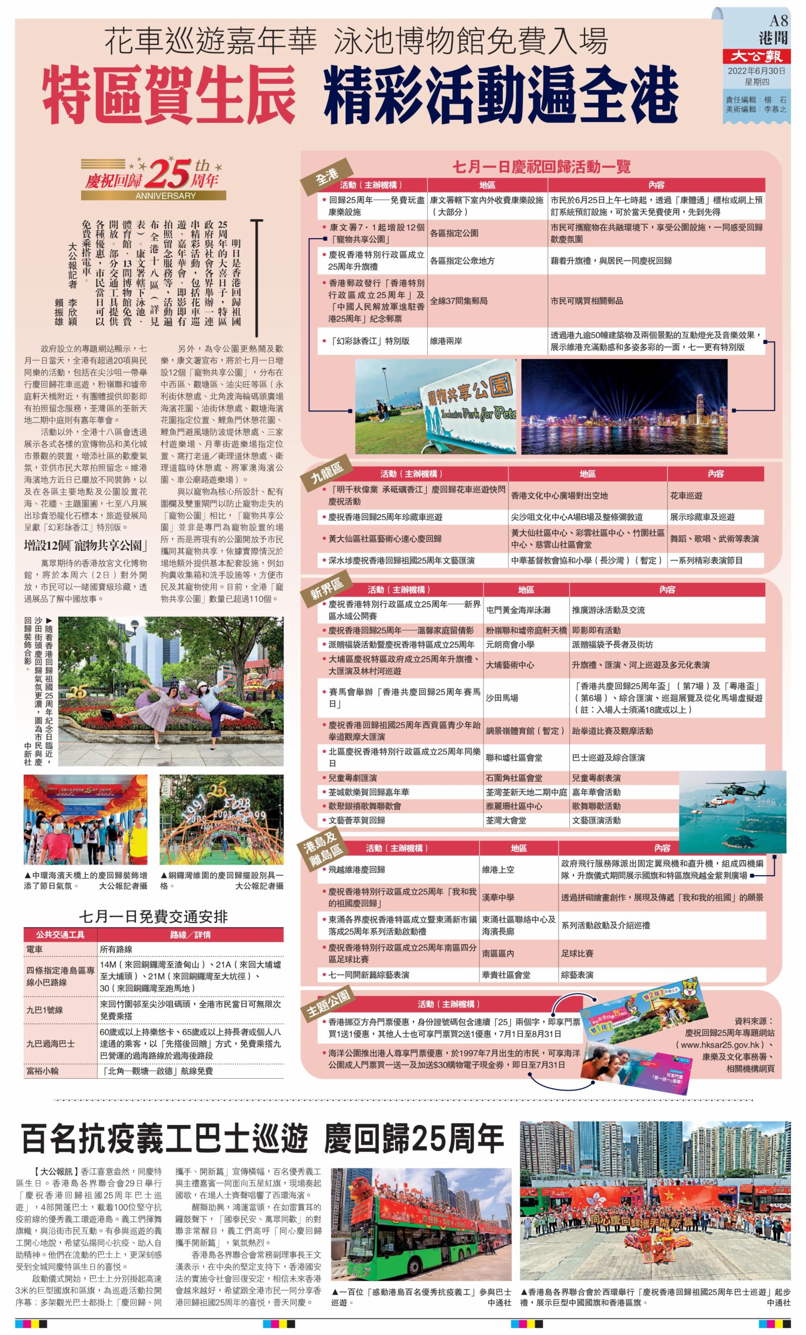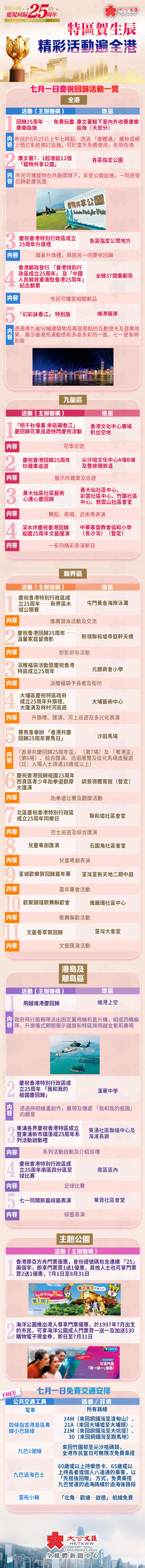(大公報記者 李欣穎、賴振雄)明日是香港回歸祖國25周年的大喜日子,特區政府與社會各界舉辦一連串精彩活動,包括花車巡遊、嘉年華會、即影即有拍照留念服務等,活動遍布全港十八區(詳見表)。康文署轄下泳池、體育館、13間博物館免費開放。部分交通工具提供各種優惠,市民當日可以免費乘搭電車。