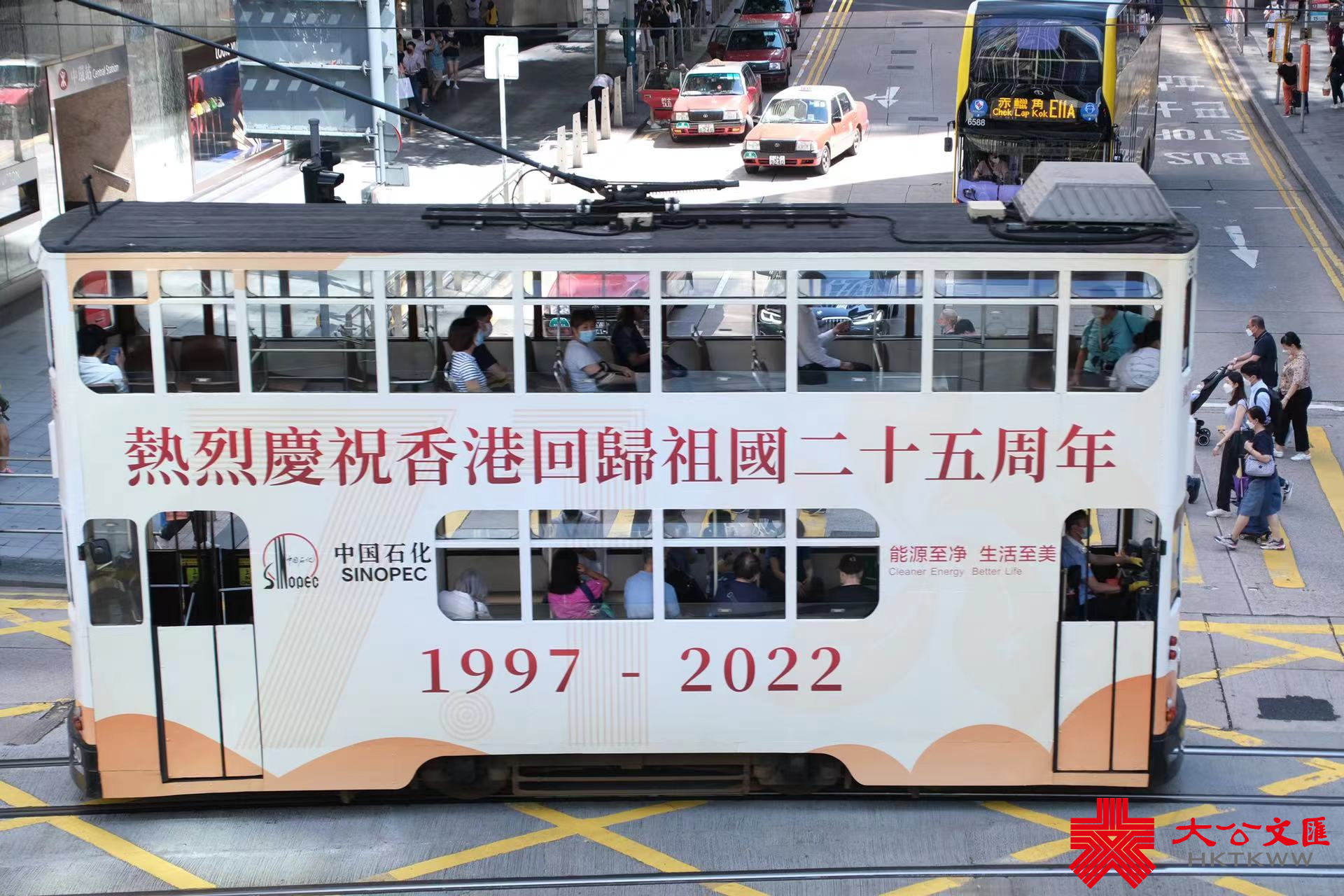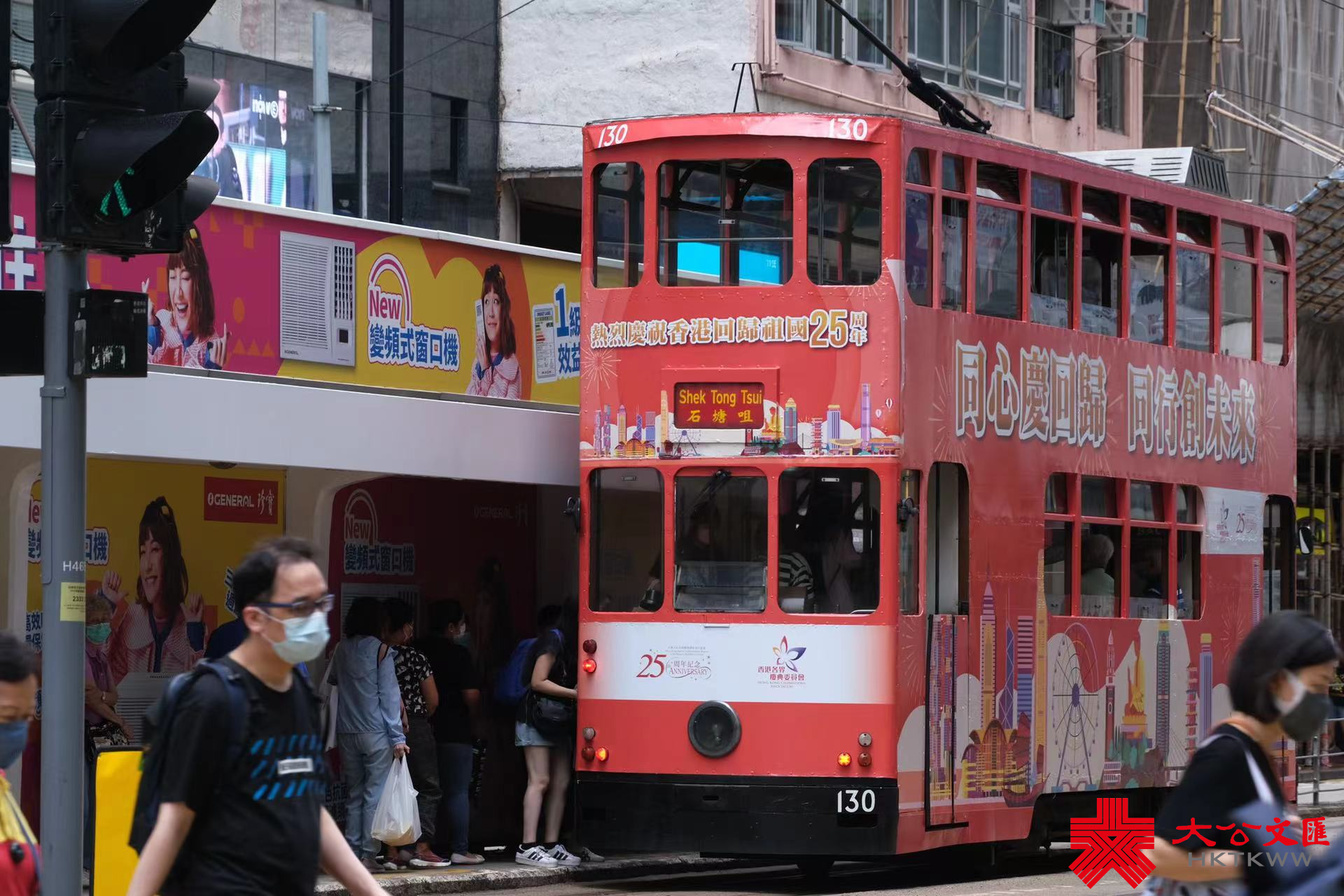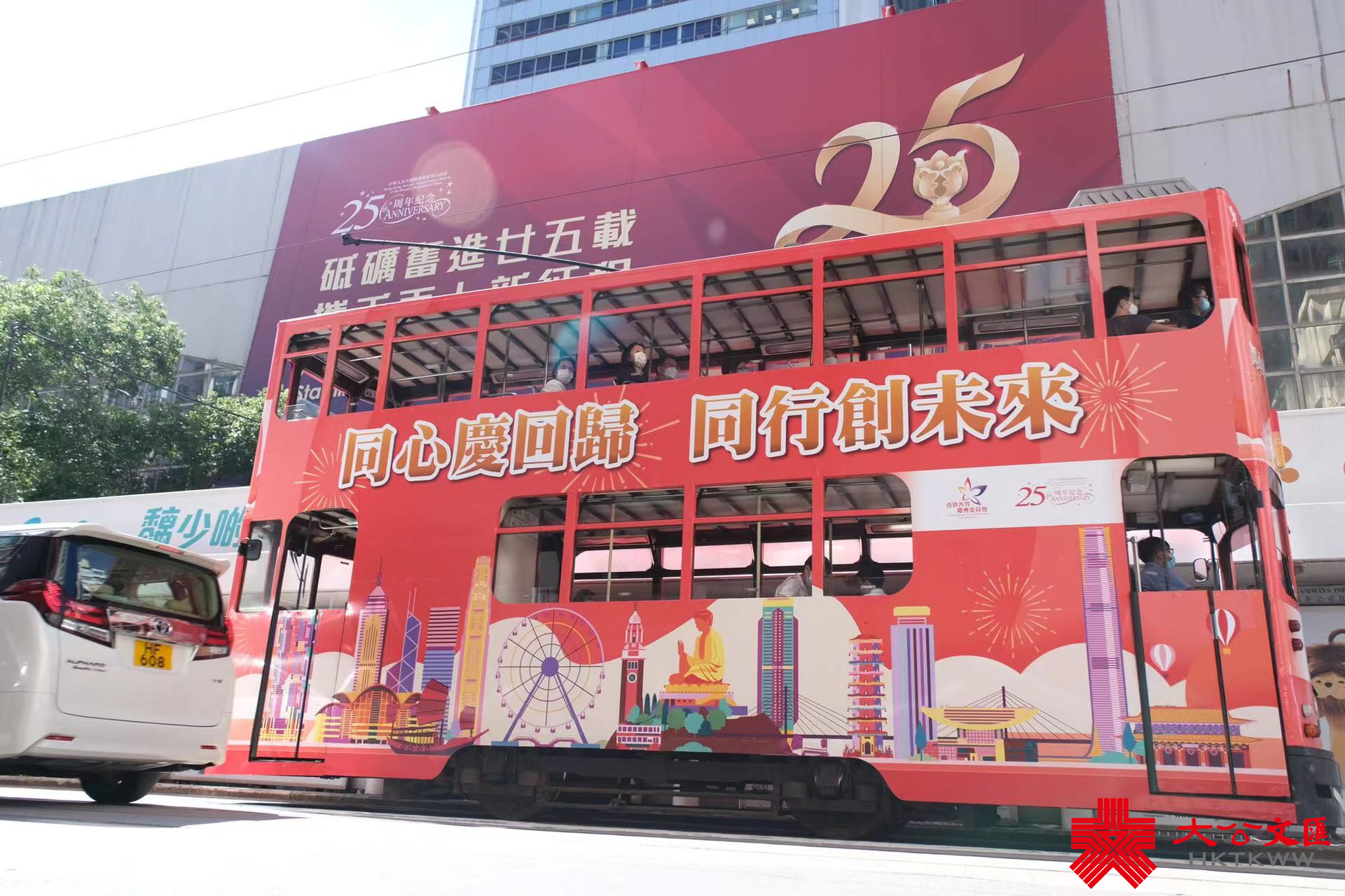 大公文匯全媒體報道,明天是香港回歸祖國25周年紀念日,港島九龍等多地的公共交通工具上裝飾了「同心慶回歸 同行創未來」的標語,穿行在大街小巷,全港各地慶祝氣氛日趨濃烈。