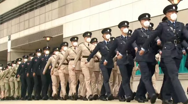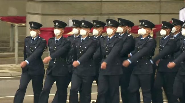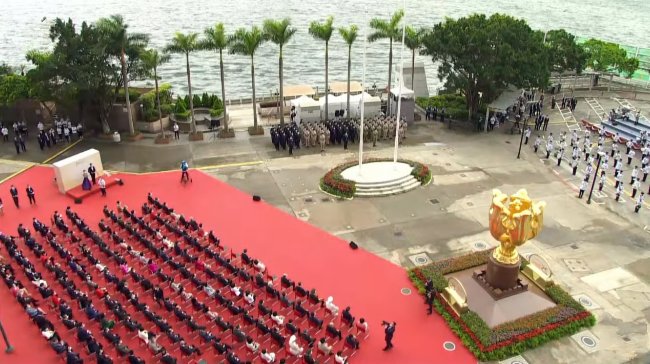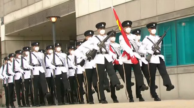 大公文匯全媒體報道,今日(7月1日)是香港回歸祖國25周年慶典日。慶祝香港回歸祖國25周年升旗儀式今日上午8時在香港會議展覽中心外的金紫荊廣場舉行。第六任行政長官李家超和政府高層官員出席。在萬眾矚目的升旗儀式上,香港警隊已全面由英式步操改為中式步操,「Yes Sir」等英文口令也被粵語「是的,長官!」取代。