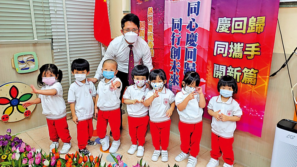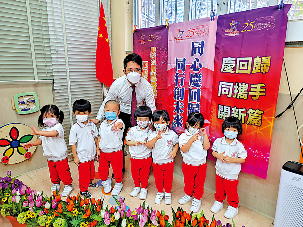 (大公報 記者 葉心弦)為慶祝香港回歸祖國25周年,香港西區婦女福利會幼稚園昨日在校內舉行升旗儀式,逾60名小朋友分批依次到國旗下肅立並齊唱國歌。校長溫志倫表示,為能讓小朋友與香港特區「慶生」,學校還購買蛋糕並舉行簡單的儀式,希望透過營造快樂的氛圍,加深學生對香港回歸的印象,以從小培養他們的國家情懷。