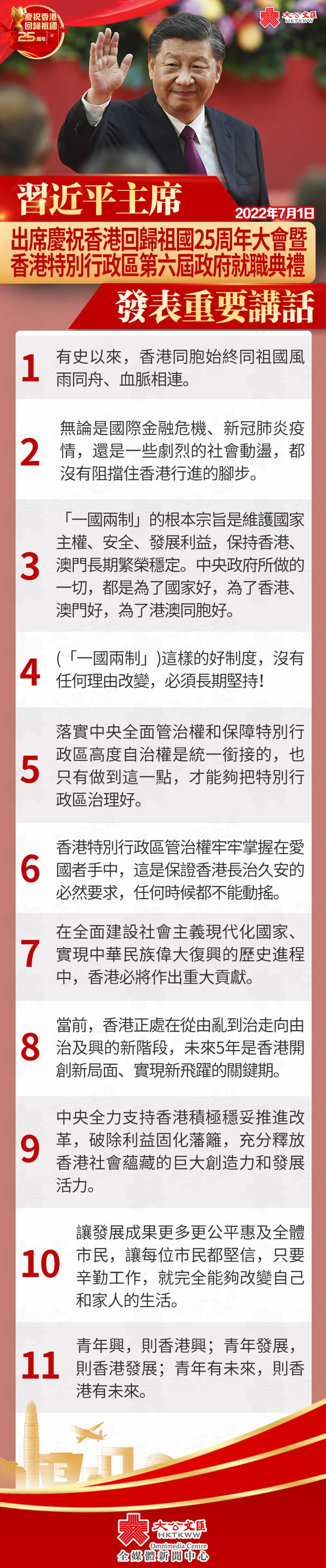 7月1日上午,慶祝香港回歸祖國25周年大會暨香港特別行政區第六屆政府就職典禮在香港會展中心隆重舉行。中共中央總書記、國家主席、中央軍委主席習近平出席並發表重要講話。以下為習近平講話全文: