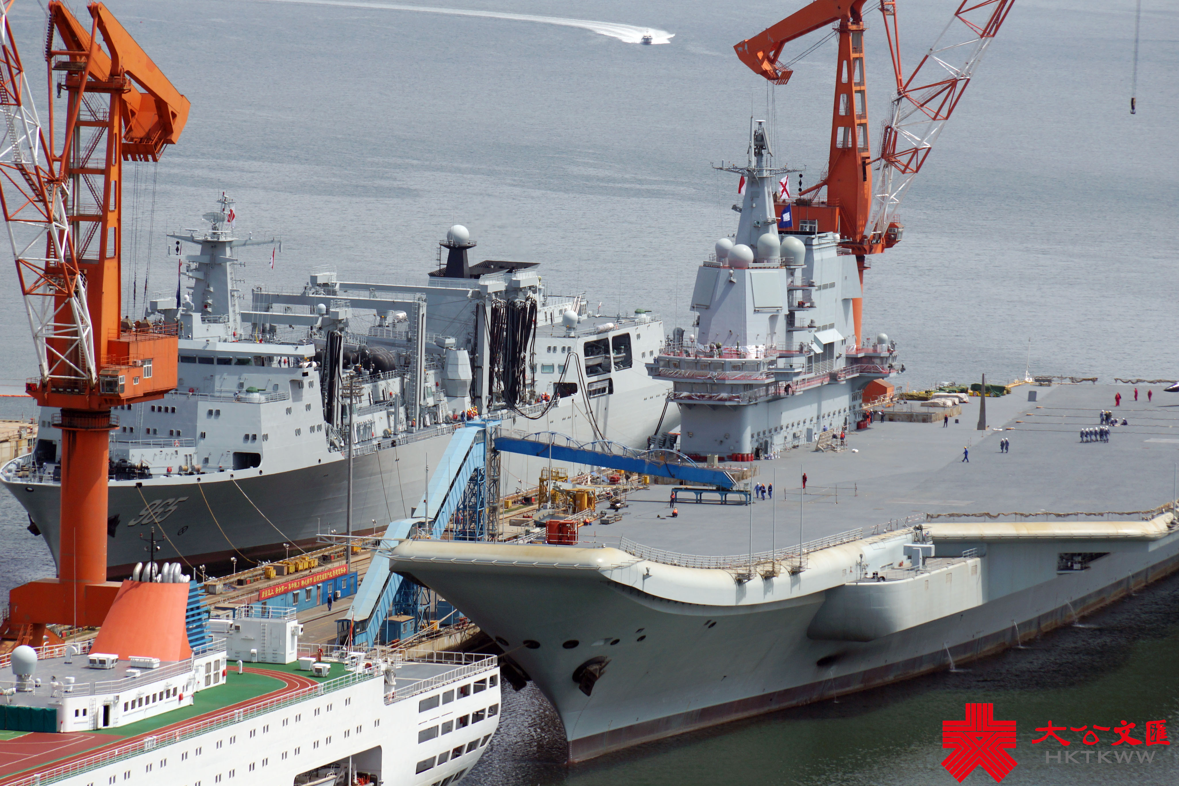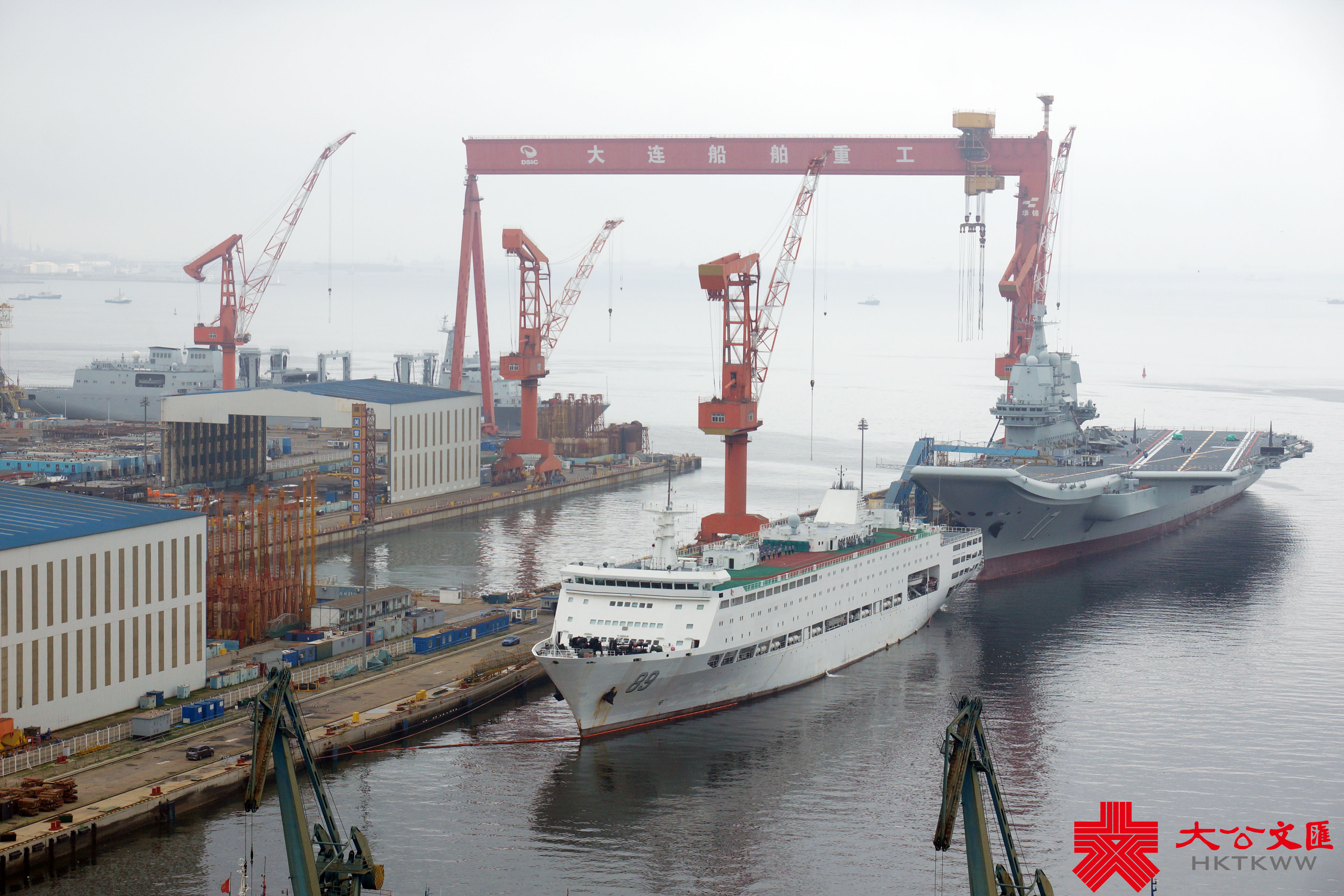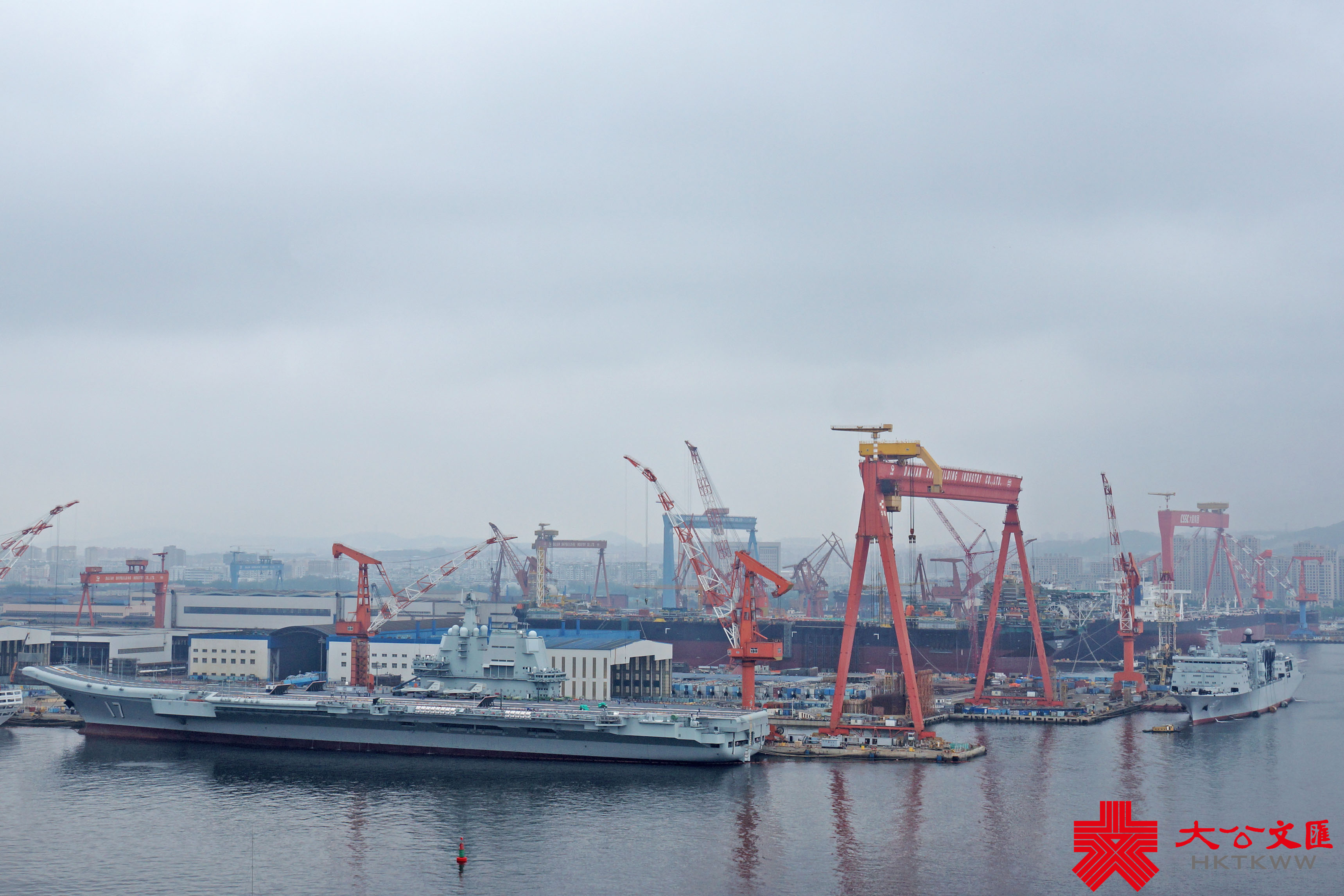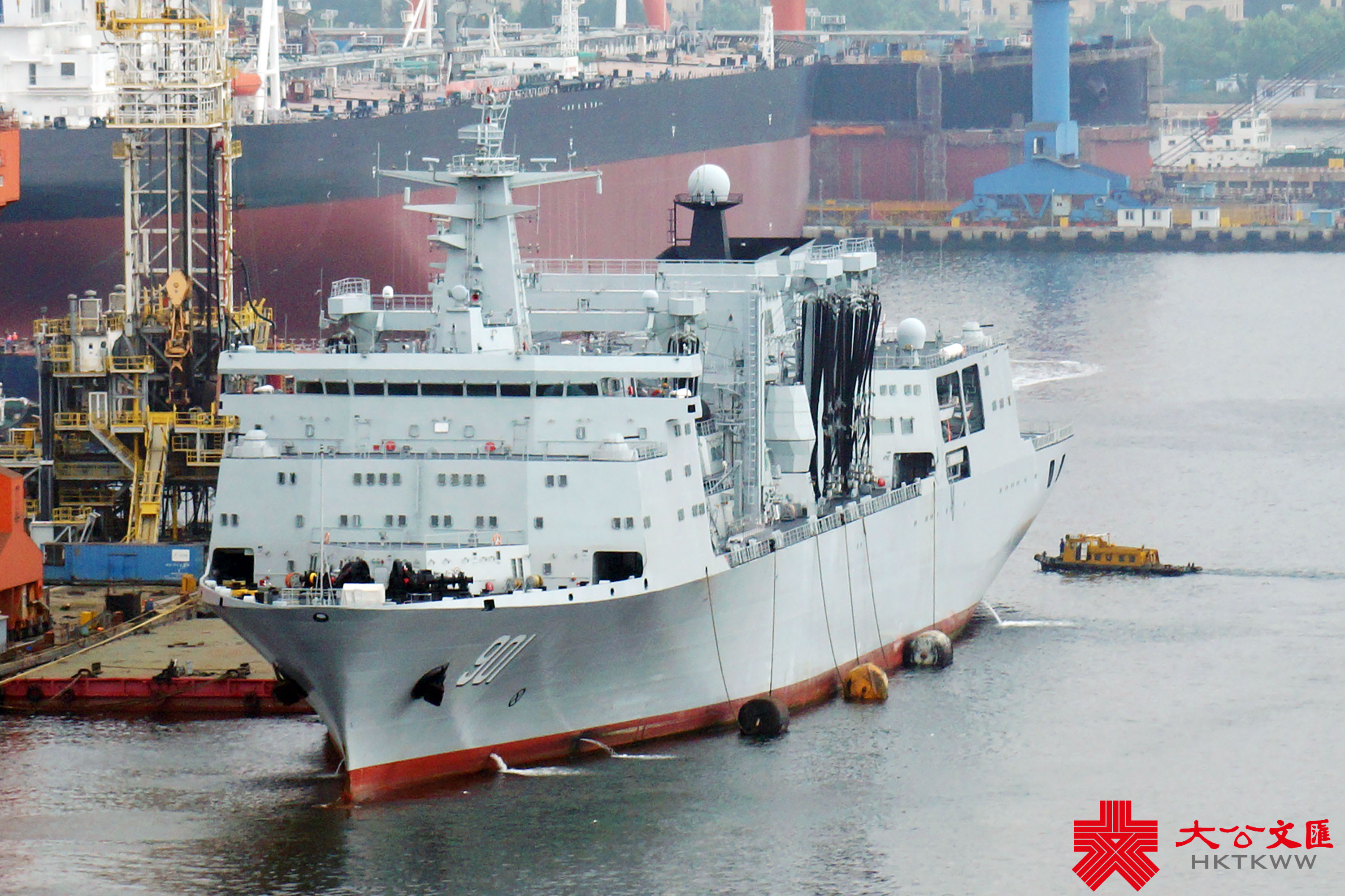 (大公文匯網記者 宋偉)7月1日,正在大連造船廠進行首次計劃內可用性提升維護的山東艦,已完成甲板塗層重鋪、劃線及艦底清理刷漆等維護工作,移出船塢。中國首艘901型綜合補給艦呼倫湖艦(舷號901)抵達船廠,在山東艦尾一側靠泊,雙艦再度「同框」。