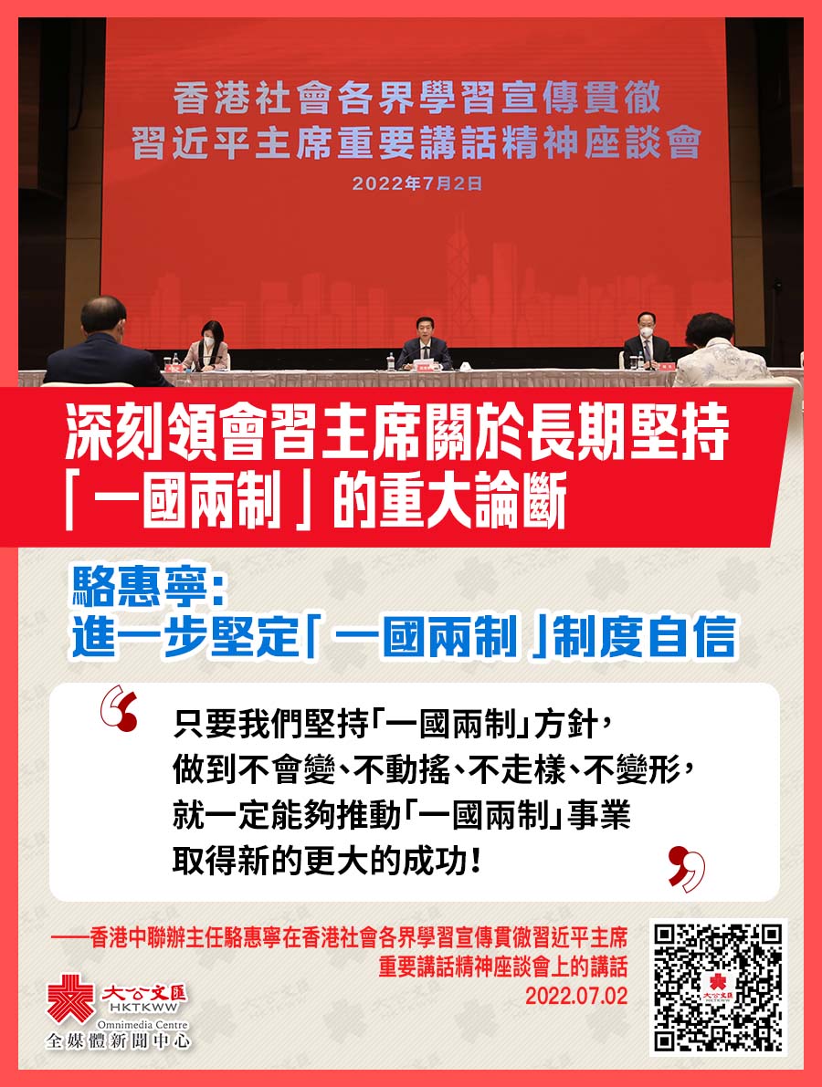駱惠寧續指,習近平主席指出,「一國兩制」是前無古人的偉大創舉,香港回歸祖國,重新納入國家治理體系。回歸以來,中國共產黨把在「一國兩制」下保持香港長期繁榮穩定作為治國理政的重大課題,不斷推進實踐基礎上的理論創新。習近平主席強調的重大論斷,再次體現了中央堅持「一國兩制」方針不是權宜之計,而是長遠大計,昭示着「一國兩制」必將在中國特色社會主義事業的發展中發展,必將隨着黨和國家事業的前進而前進。這一重大論斷,展現了香港「一國兩制」實踐的光明前景。
