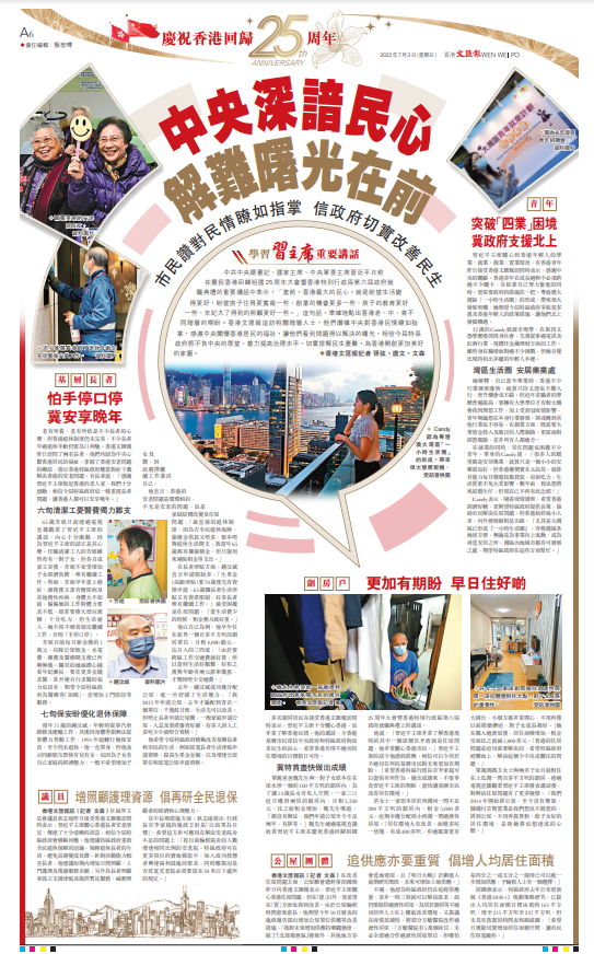 【香港文匯報記者 張弦、唐文、文森】中共中央總書記、國家主席、中央軍委主席習近平日前在慶祝香港回歸祖國25周年大會暨香港特別行政區第六屆政府就職典禮的重要講話中表示,「當前,香港最大的民心,就是盼望生活變得更好,盼望房子住得更寬敞一些、創業的機會更多一些、孩子的教育更好一些、年紀大了得到的照顧更好一些。」這句話,準確地點出香港老、中、青不同階層的期盼。香港文匯報追訪相關階層人士,他們讚嘆中央對香港民情瞭如指掌,感激中央關懷香港居民的福祉,讓他們看到問題得以解決的曙光,相信今屆特區政府將不負中央的厚望,着力提高治理水平,切實排解民生憂難,為香港開創更加美好的家園。