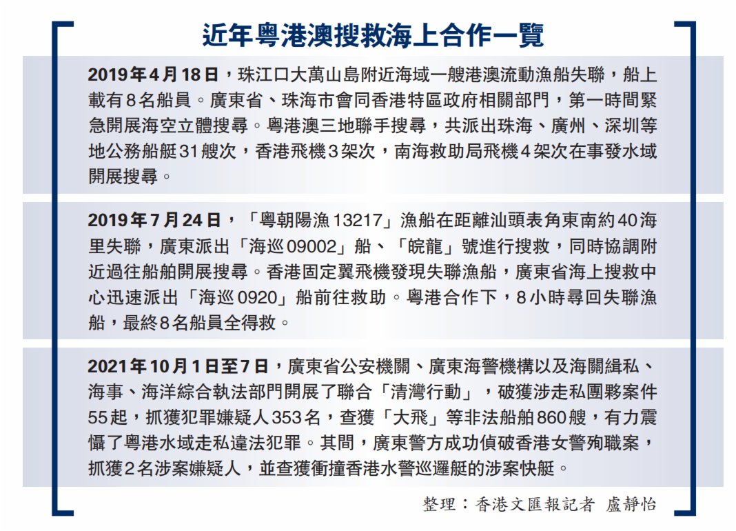 據廣東省海事局透露,2021年,粵港澳三地開展海上搜救合作268次。今年粵港澳也正在完善大灣區水上應急搜救合作機制,包括深化完善粵港澳搜救聯動合作機制,完善大灣區防抗颱風等自然災害應急聯動機制,推動聯合制定大灣區防抗颱風應急預案,協調颱風預警工作,協同開展災害天氣後交通組織、海難救助打撈等合作。