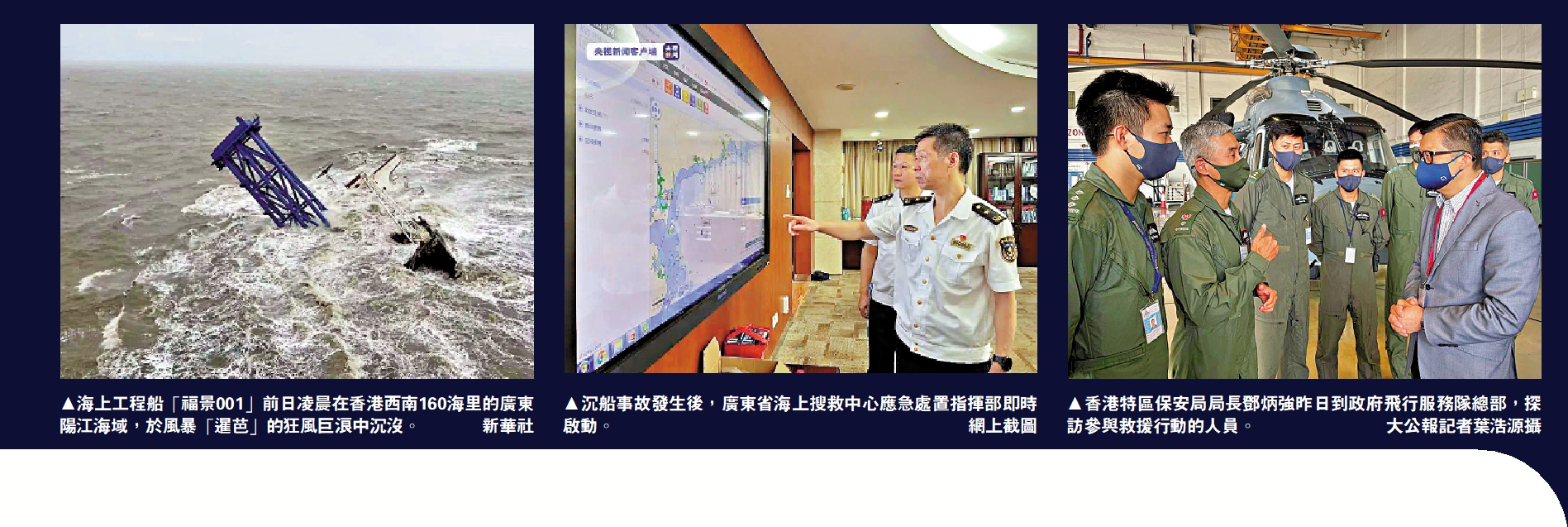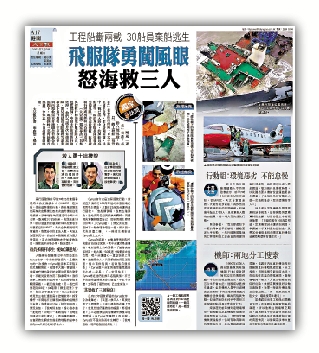 (大公報 記者 盧靜怡 葉浩源)颱風「暹芭」吹襲下,一艘內地工程船前日在香港西南一百六十海里、廣東陽江海域沉沒,30人墮海。粵港兩地迅速展開救援。特區政府飛行服務隊勇闖風眼,成功救起3名船員。